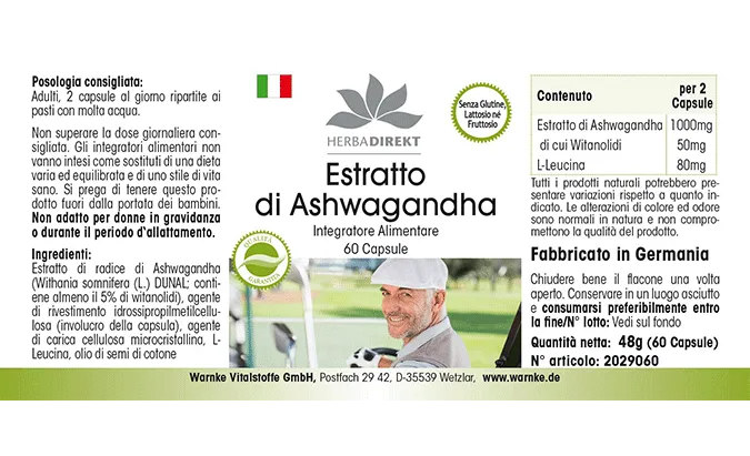 Extracto de Ashwagandha (Withania somnifera; contiene al menos un 5% de withanólidos), agente de carga celulosa microcristalina, agente de recubrimiento hidroxipropilmetilcelulosa (cubierta de la cápsula), L-Leucina