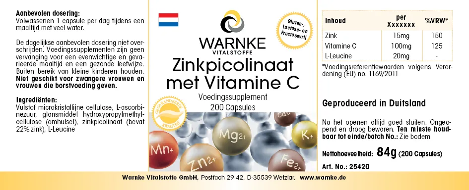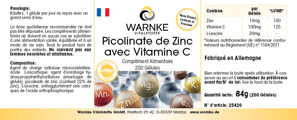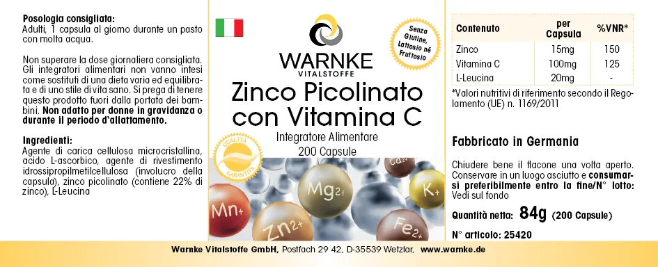 Agente de carga celulosa microcristalina, ácido L-Ascórbico, agente de recubrimiento hidroxipropilmetilcelulosa (cubierta de la cápsula), picolinato de zinc (contiene un 22% zinc), L-Leucina