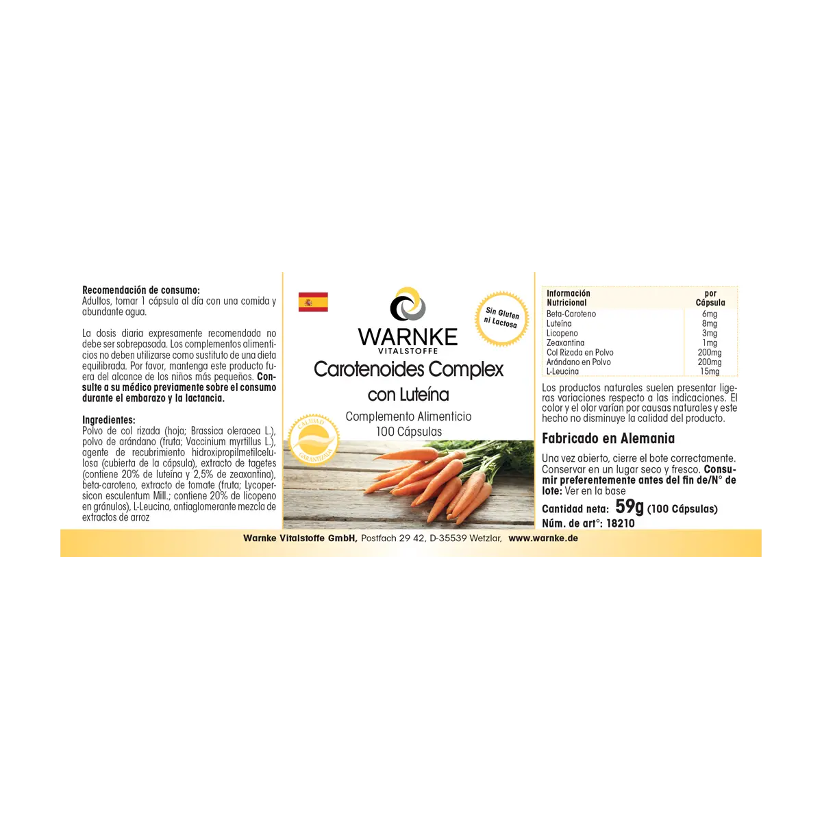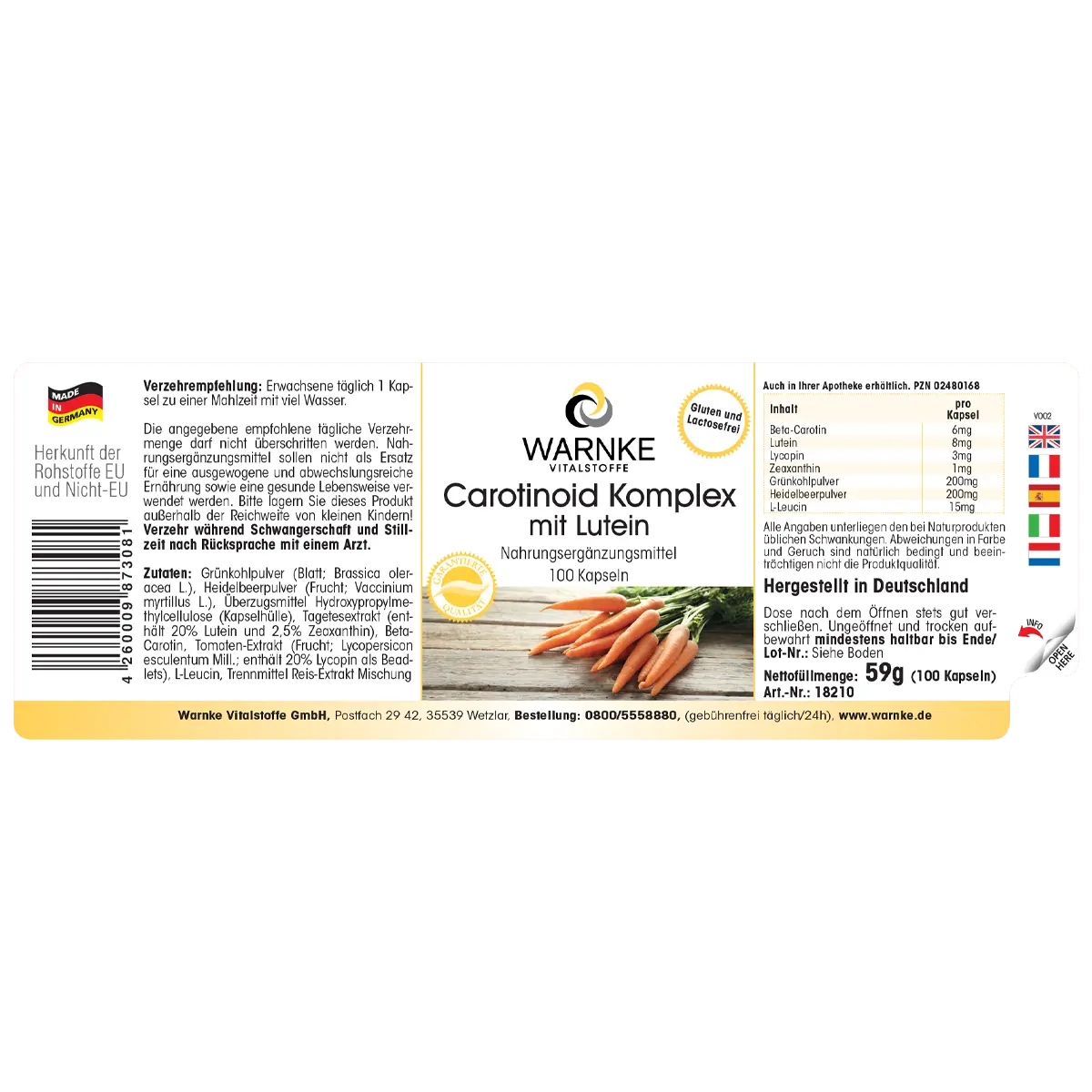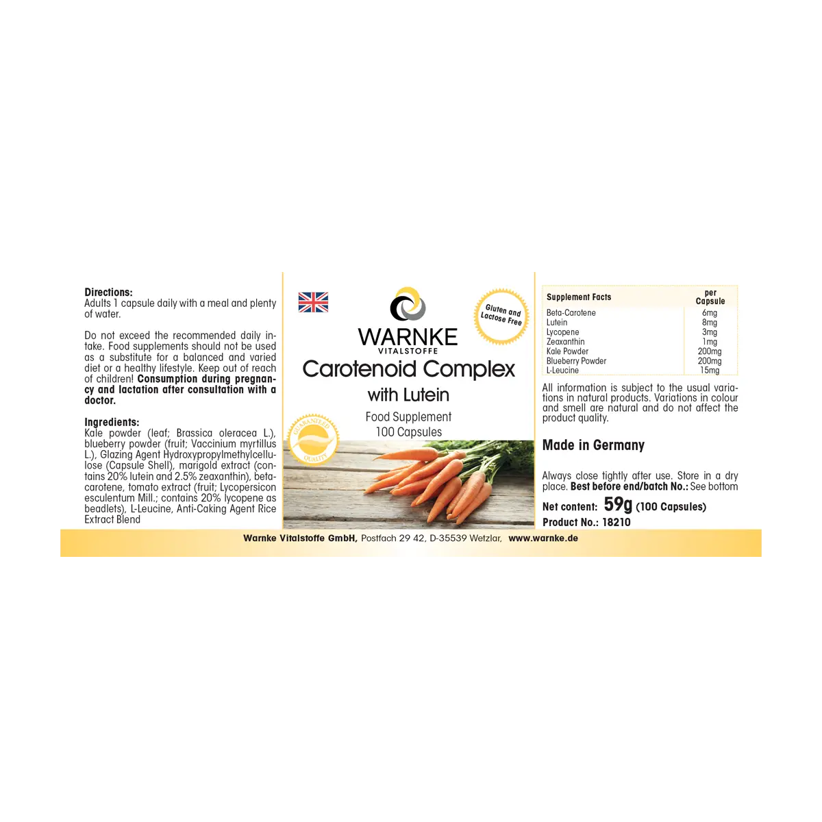 Chou frisé en poudre, myrtille en poudre, agent d'enrobage hydroxypropylméthylcellulose (enveloppe de la gélule), extrait de tagète (avec 20% de lutéine et 2,5% de zéaxanthine), bêta-carotène (20%), lycopène (Beadlets; contiennent 20% de lycopène à base de tomates), L-Leucine
