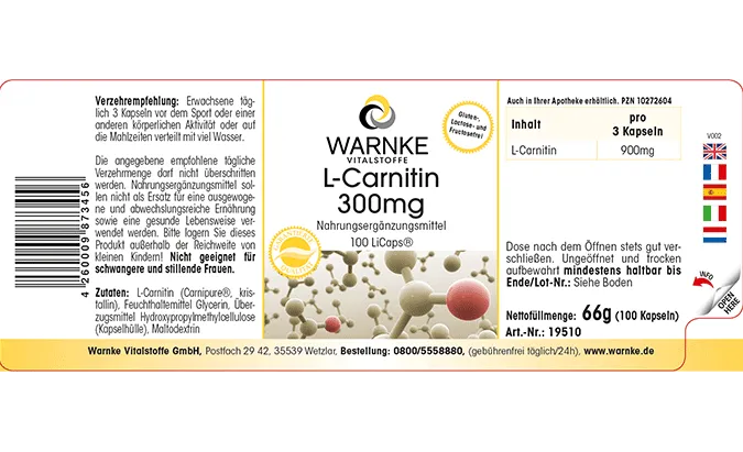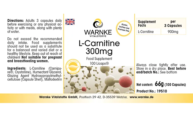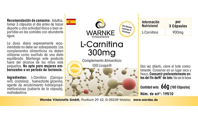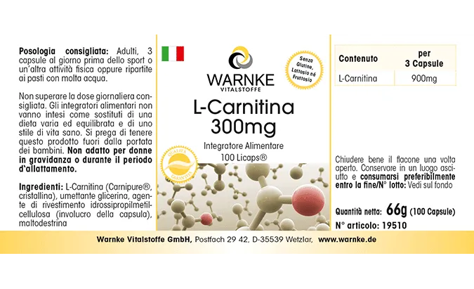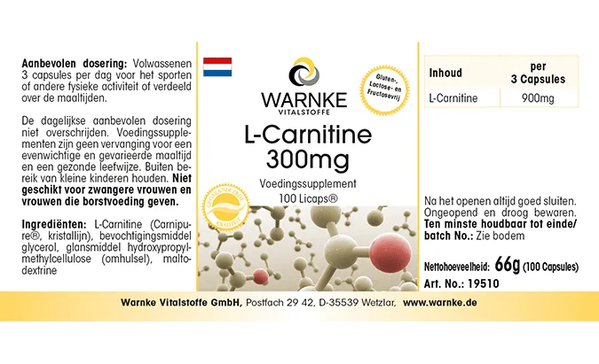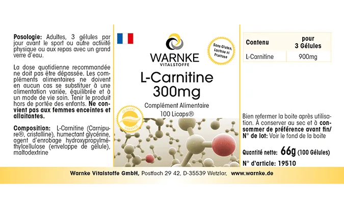 L-Carnitine-L-Tartrate (45%), agent d'enrobage hydroxypropylméthylcellulose (enveloppe de la gélule), glycérine, maltodextrine