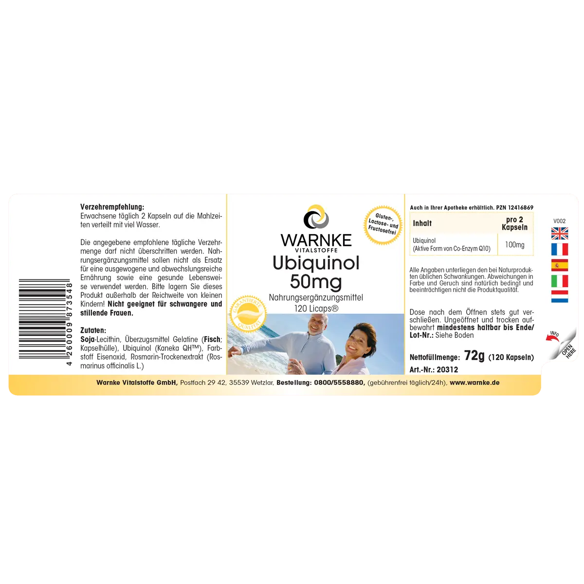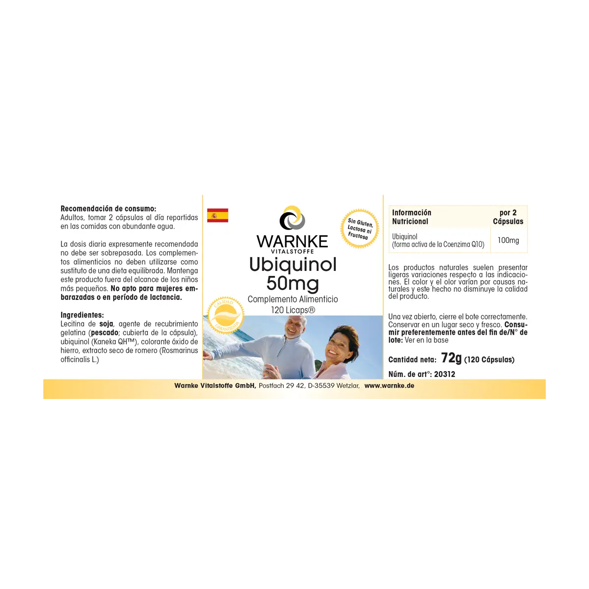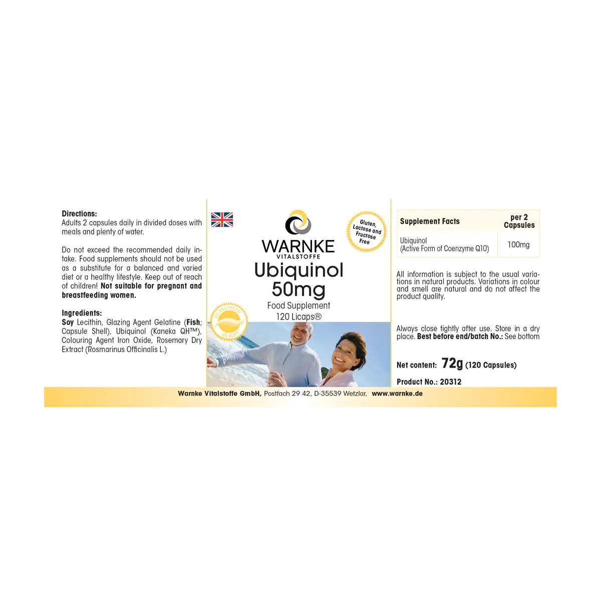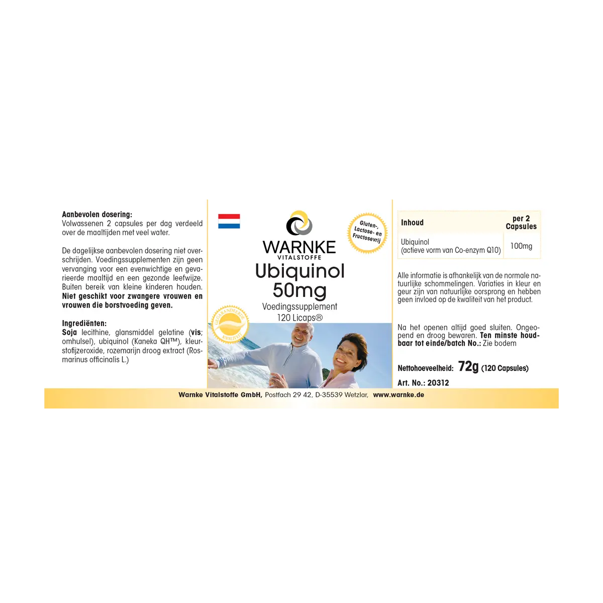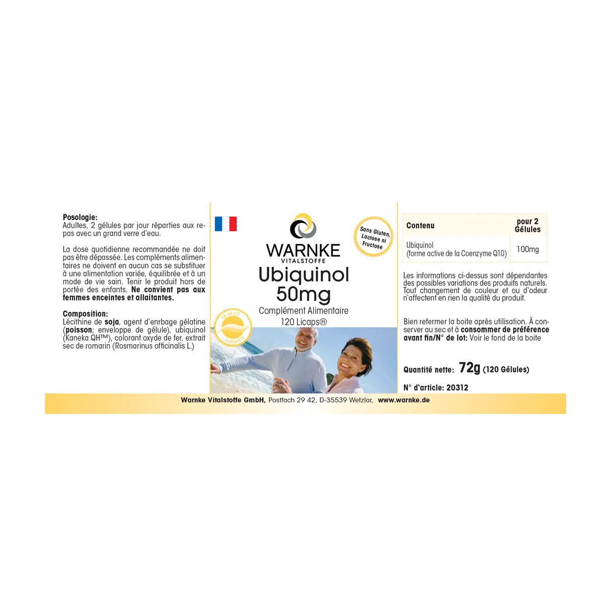 Lécithine de soja, agent d‘enrbage gélatine (poisson; enveloppe de gélule), ubiquinol (Kaneka QHTM), colorant oxyde de fer, extrait sec de romarin (Rosmarinus officinalis L.)