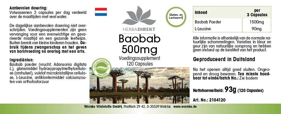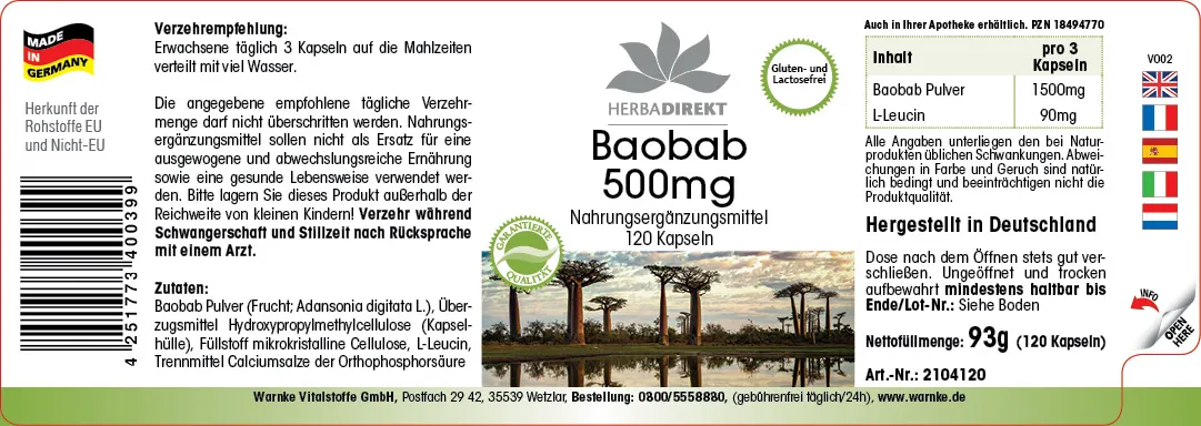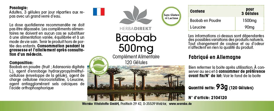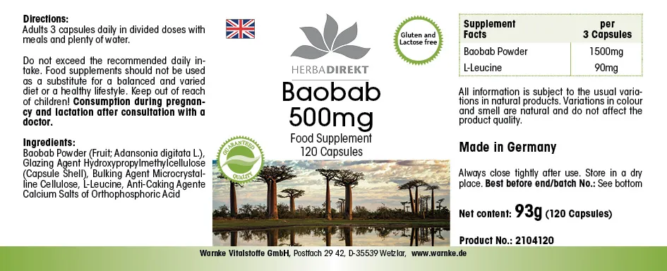 Baobab Pulver (Frucht; Adansonia digitata L.), Überzugsmittel Hydroxypropylmethylcellulose (Kapselhülle), Füllstoff mikrokristalline Cellulose, L-Leucin, Trennmittel Calciumsalze der Orthophosphorsäure