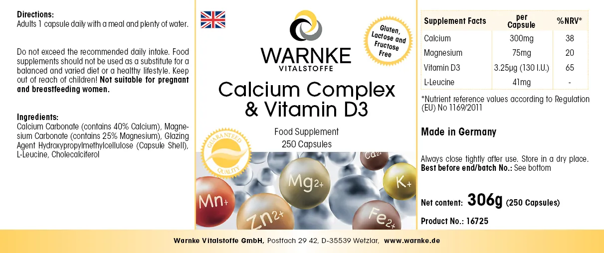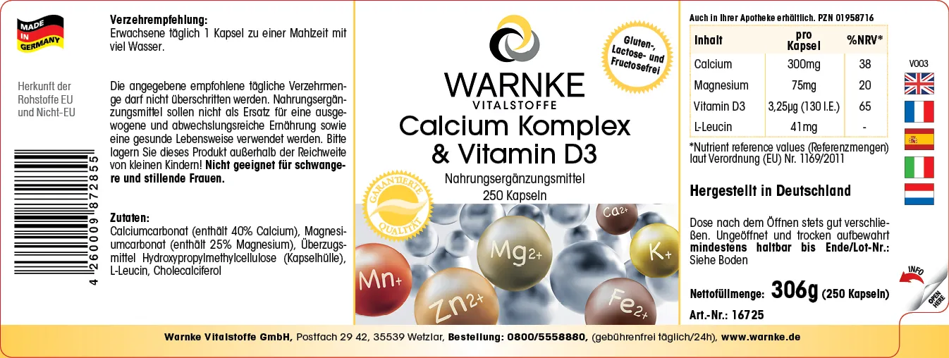 Calciumcarbonat (64%), Magnesiumcarbonat (25%), Überzugsmittel Hydroxypropylmethylcellulose (Kapselhülle), Cholecalciferol