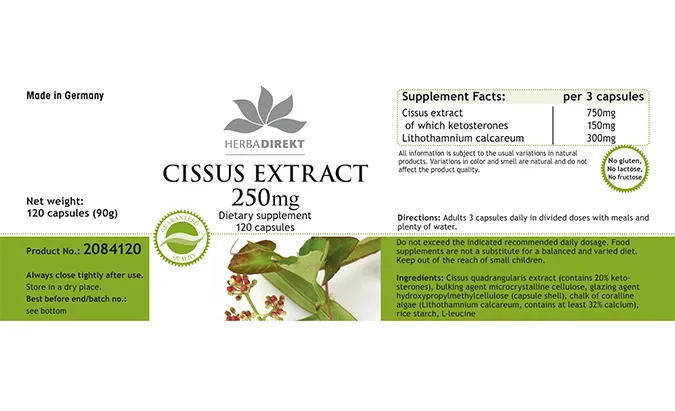 Cissus Quadrangularis-Extrakt (enthält 20% Ketosterone), Füllstoff mikrokristalline Cellulose, Überzugsmittel Hydroxypropylmethylcellulose (Kapselhülle), Korallenalgenkalk (Lithothamnium calcareum, enthält mindestens 32% Calcium), Reisstärke, L-Leucin
