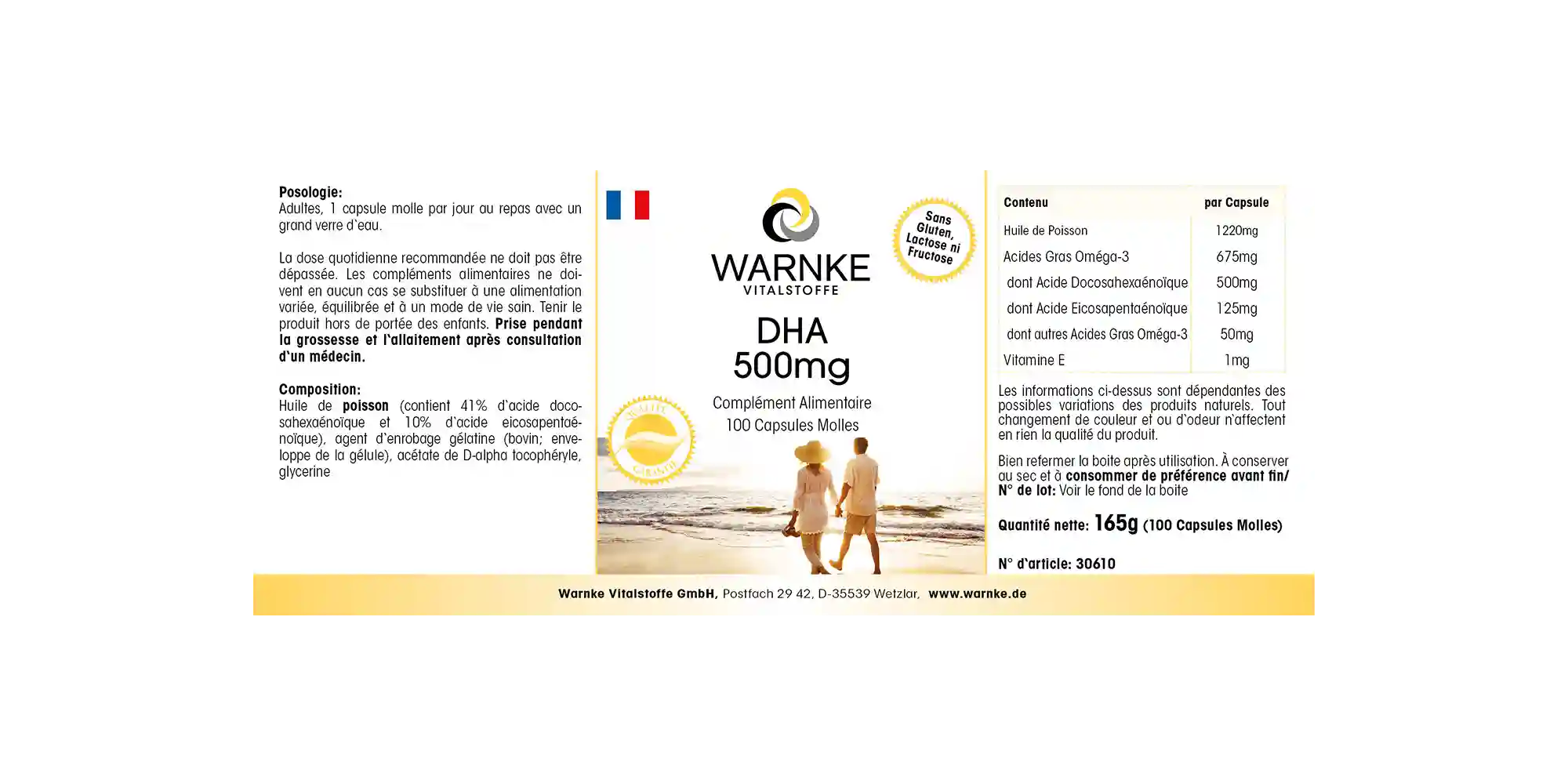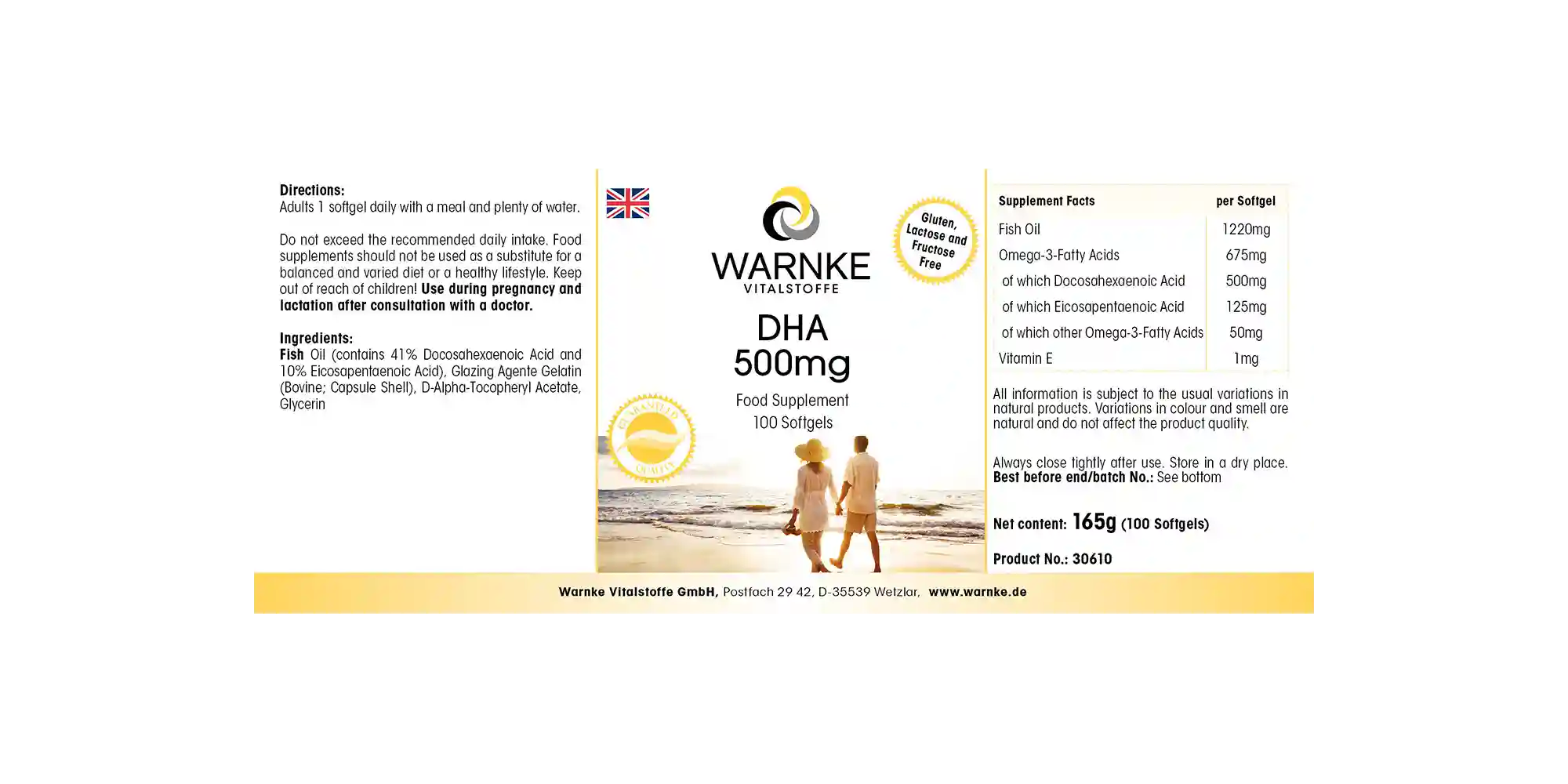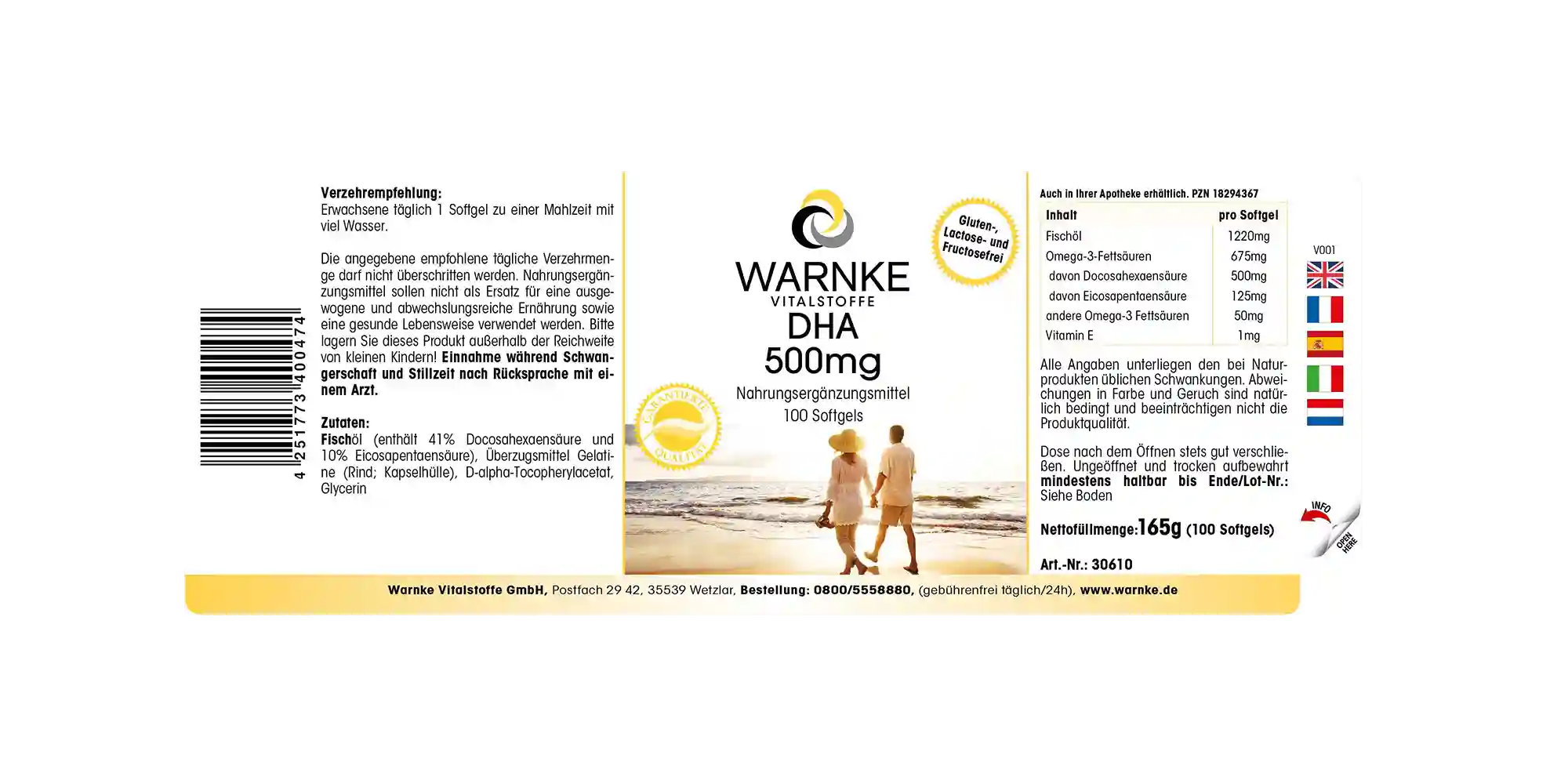 Fischöl (enthält 41% Docosahexaensäure und 10% Eicosapentaensäure), Überzugsmittel Gelatine (Rind; Kapselhülle), D-alpha-Tocopherylacetat,Glycerin