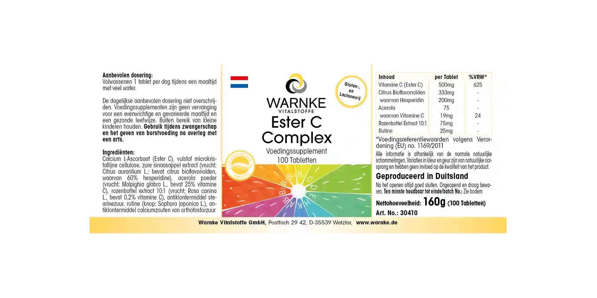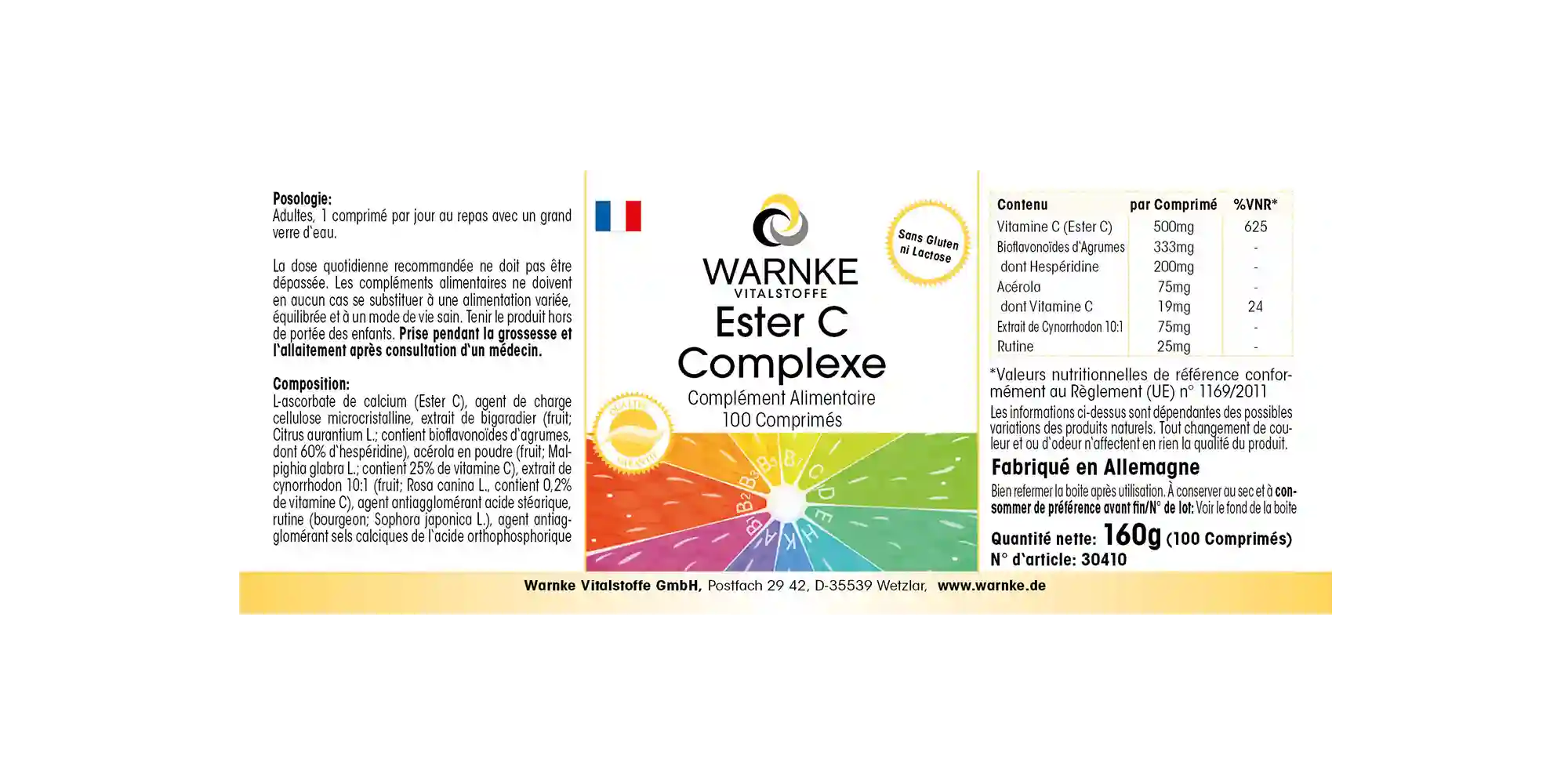 Calcium-L-Ascorbat (Ester C), Füllstoff mikrokristalline Cellulose, Bitterorangen-Extrakt (Frucht; Citrus aurantium L.; enthält Citrusbioflavonoide, darunter 60% Hesperidin), Acerola Pulver (Frucht; Malpighia glabra L., enthält 25% Vitamin C), Hagebutten-Extrakt 10:1 (Frucht; Rosa canina L., enthält 0,2% Vitamin C), Trennmittel Stearinsäure, Rutin (Knospe; Sophora japonica L.), Trennmittel Calciumsalze der Ortophosphorsäure
