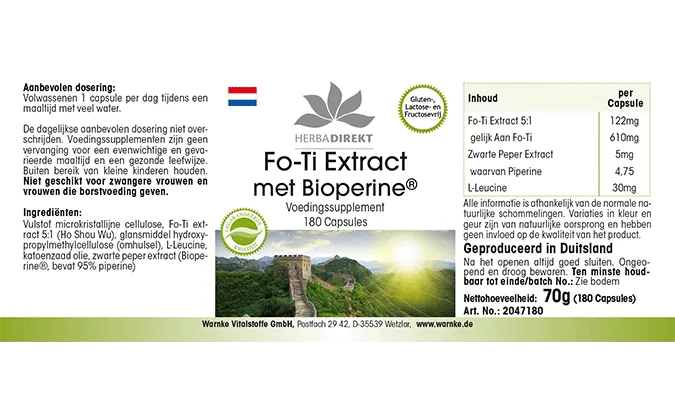 Füllstoff mikrokristalline Cellulose, Fo-Ti Extrakt 5:1 (Ho Shou Wu), Überzugsmittel Hydroxypropylmethylcellulose (Kapselhülle), L-Leucin, Baumwollsamenöl, Schwarzer Pfeffer-Extrakt (Bioperine, enthält 95% Piperin)