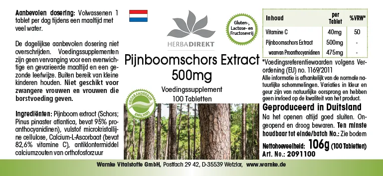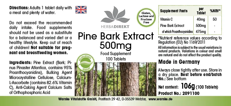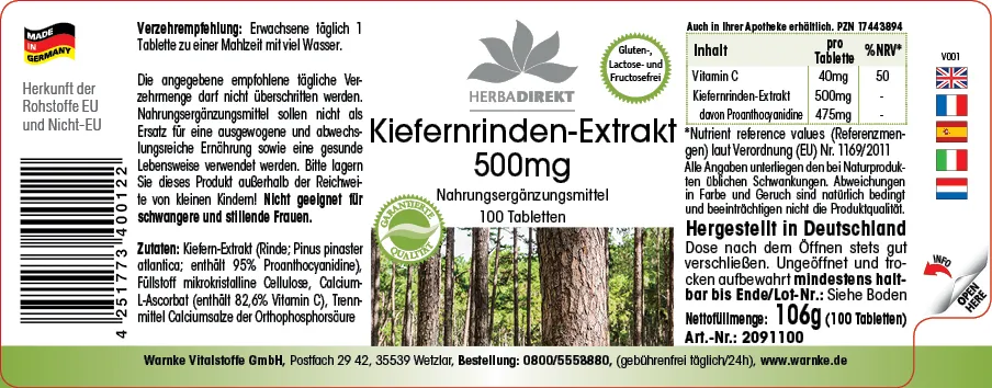Zutaten: Kiefern-Extrakt (Rinde; Pinus pinaster atlantica; enthält 95% Proanthocyanidine), Füllstoff mikrokristalline Cellulose, Calcium-L-Ascorbat (enthält 82,6% Vitamin C), Trennmittel Calciumsalze der Orthophosphorsäure