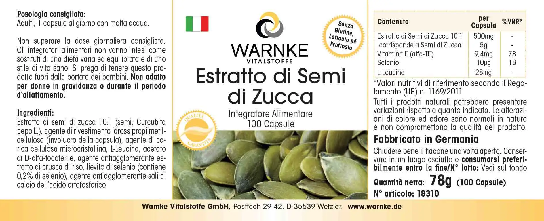 Kürbiskern Extrakt, Überzugsmittel Hydroxypropylmethylcellulose (Kapselhülle), Füllstoff mikrokristalline Cellulose, L-Leucin, D-alpha-Tocopherylacetat, Reiskleie-Extrakt, Selenhefe, Calciumsalze der Orthophosphorsäure