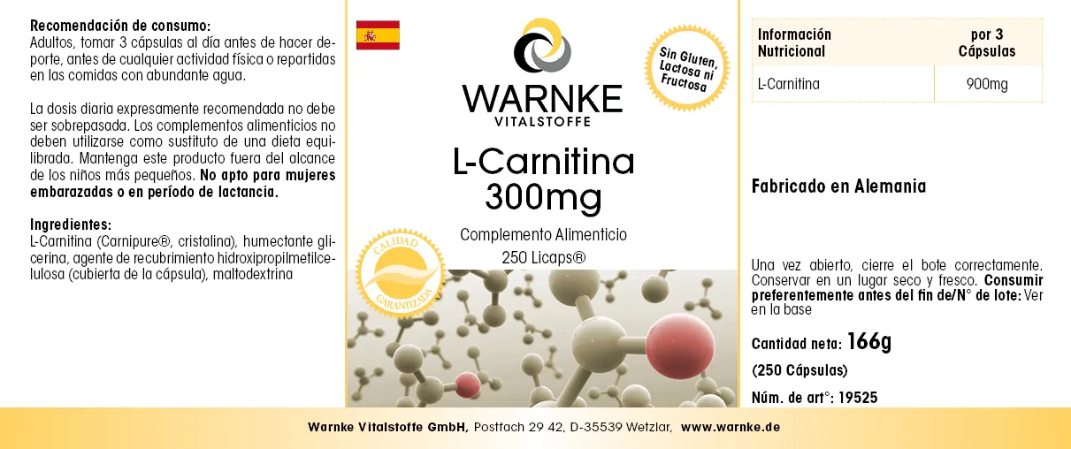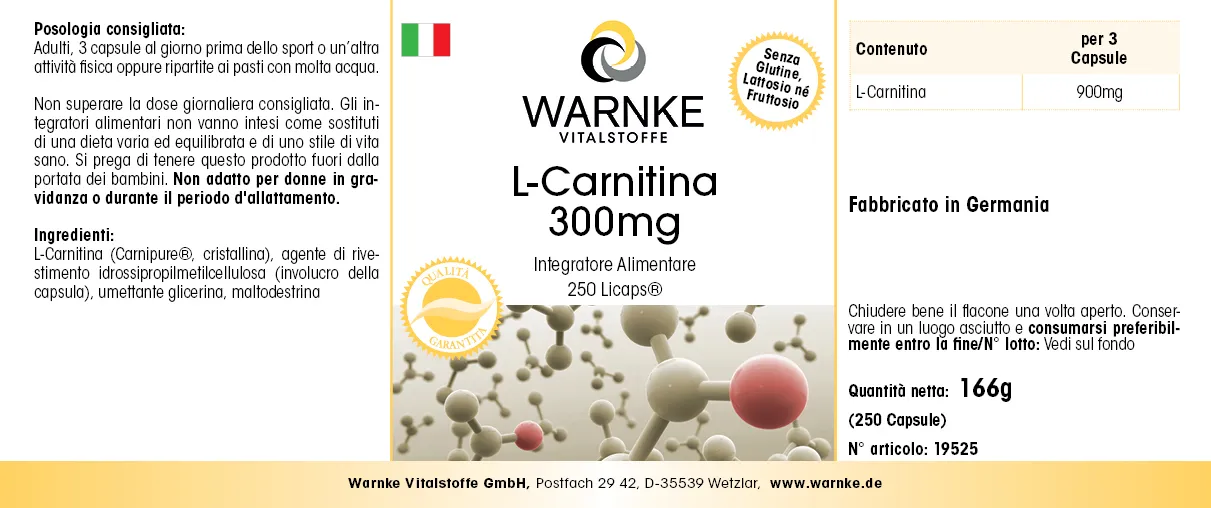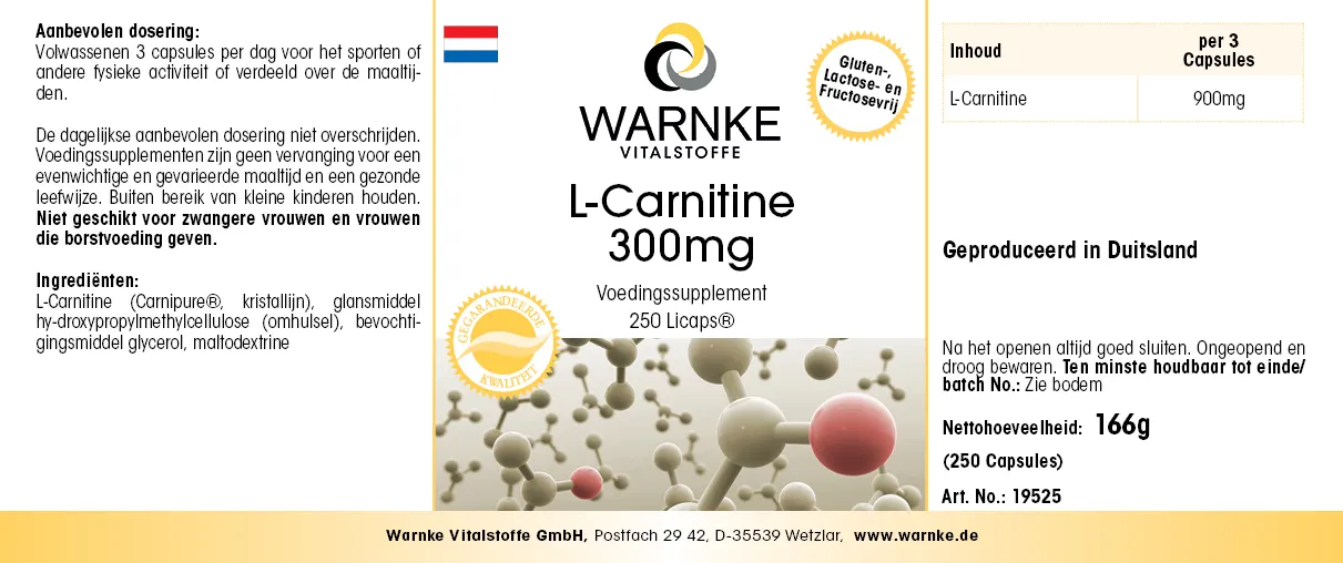 L-Carnitin-L-Tartrat (45%), Überzugsmittel Hydroxypropylmethylcellulose (Kapselhülle), Feuchthaltemittel Glycerin, Maltodextrin