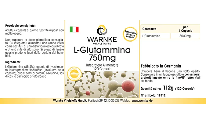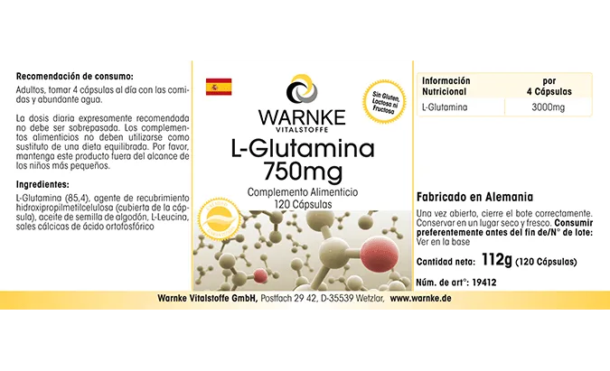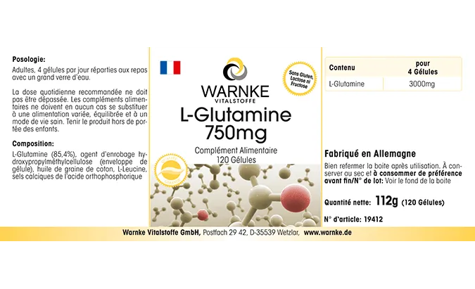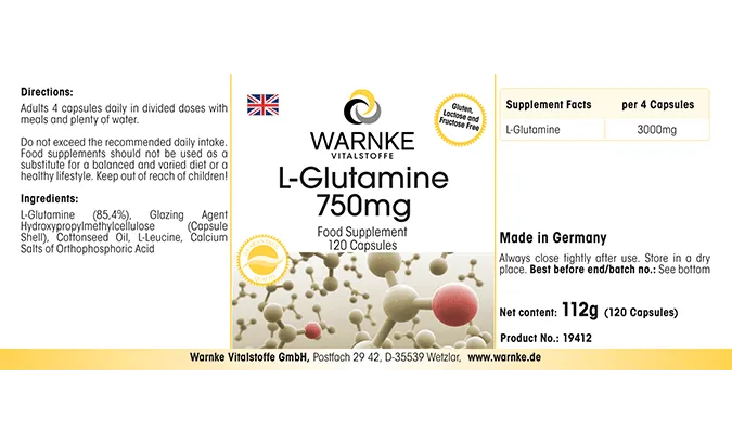 L-Glutamin (85,4%), Überzugsmittel Hydroxypropylmethylcellulose (Kapselhülle), L-Leucin, Baumwollsamenöl, Calciumsalze der Orthophosphorsäure