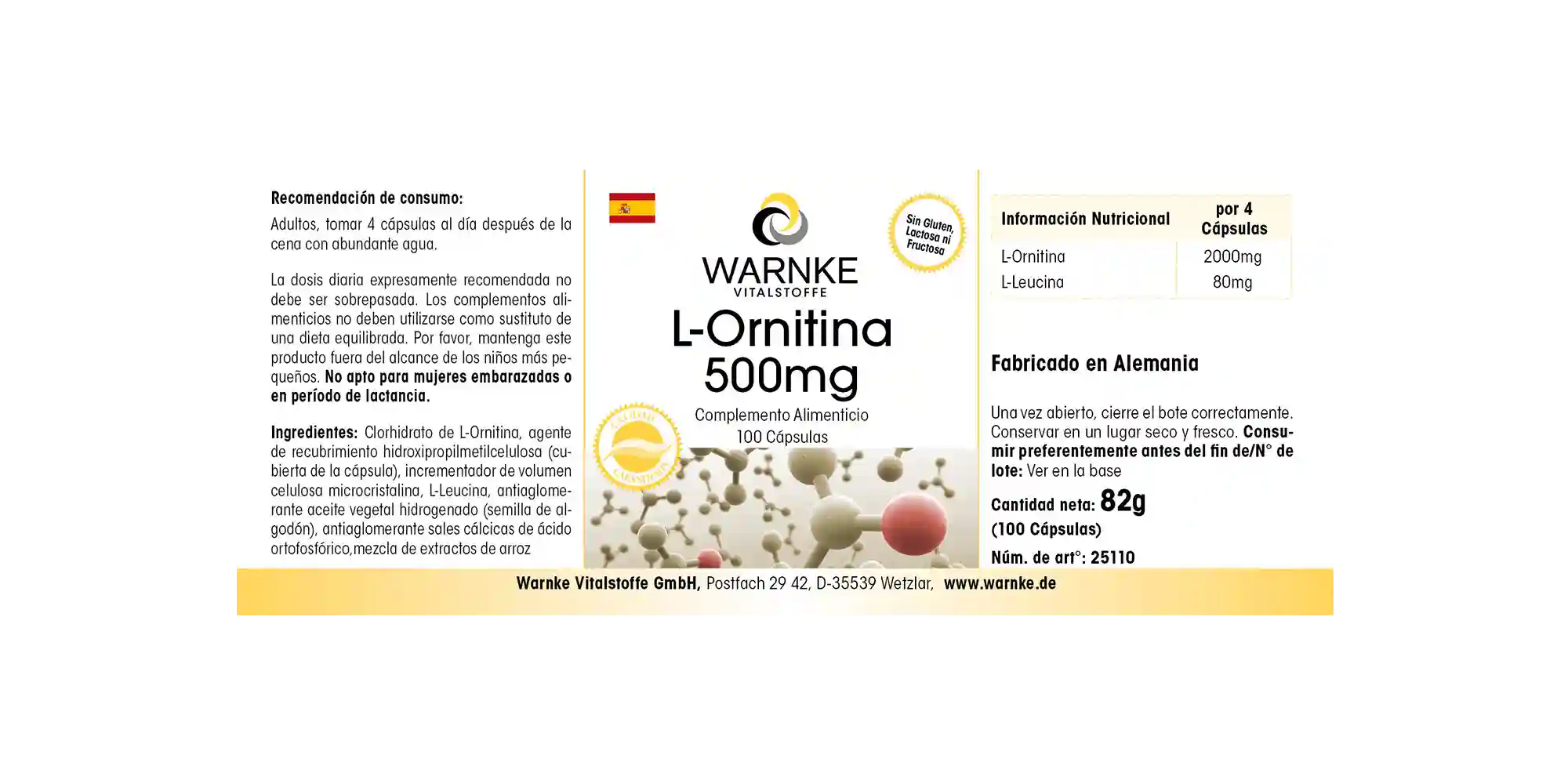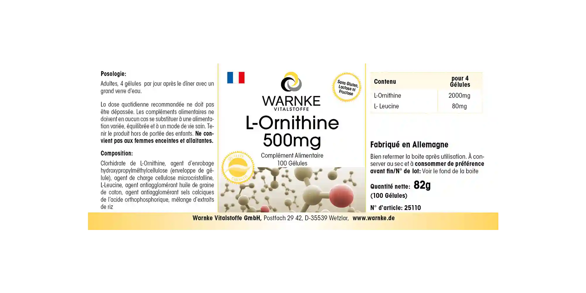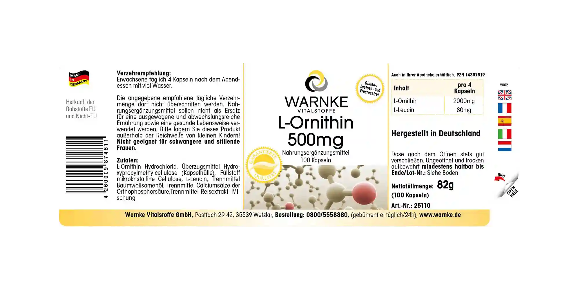 L-Ornithin Hydrochlorid, Überzugsmittel Hydroxypropylmethylcellulose (Kapselhülle), Füllstoff mikrokristalline Cellulose, L-Leucin, Reisextrakt-Mischung
