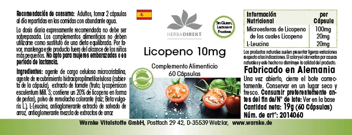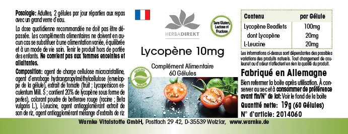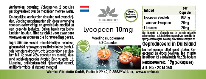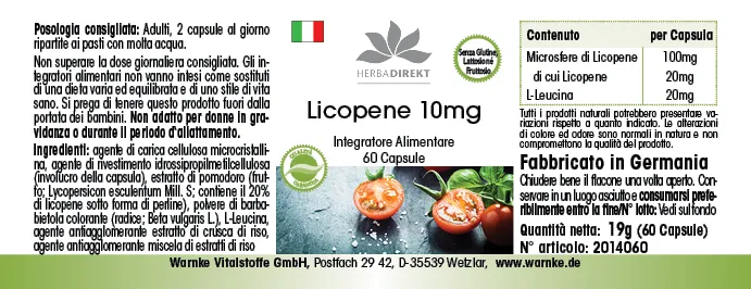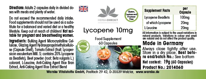 Tomaten-Extrakt (61%; enthält 5% Lycopin), Überzugsmittel Hydroxypropylmethylcellulose (Kapselhülle), Füllstoff mikrokristalline Cellulose, L-Leucin