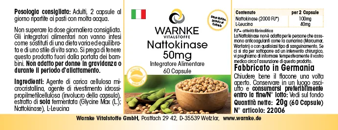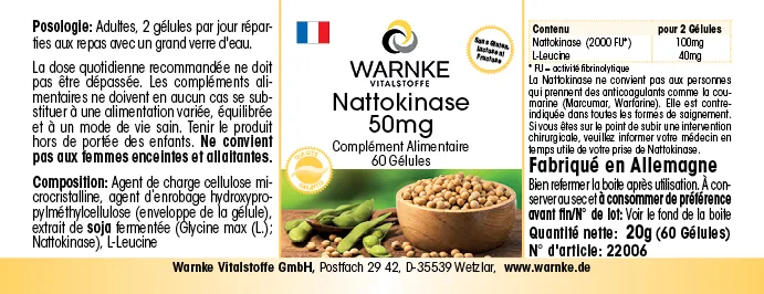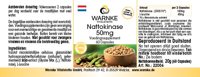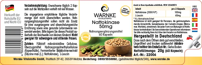 Füllstoff mikrokristalline Cellulose, Überzugsmittel Hydroxypropylmethylcellulose (Kapselhülle), Nattokinase (aus fermentiertem Soja), L-Leucin, Calciumsalze der Orthophosphorsäure