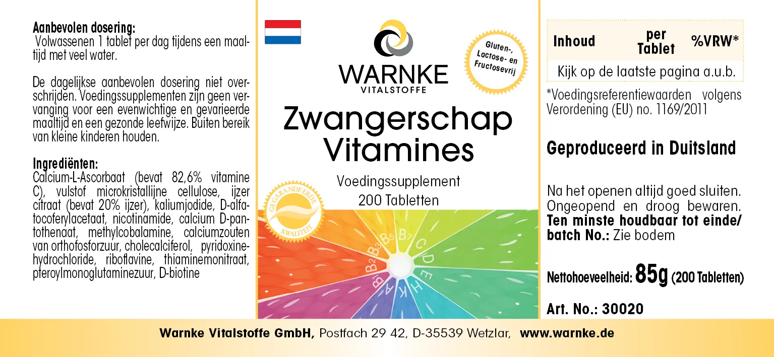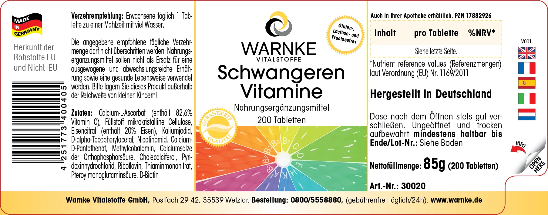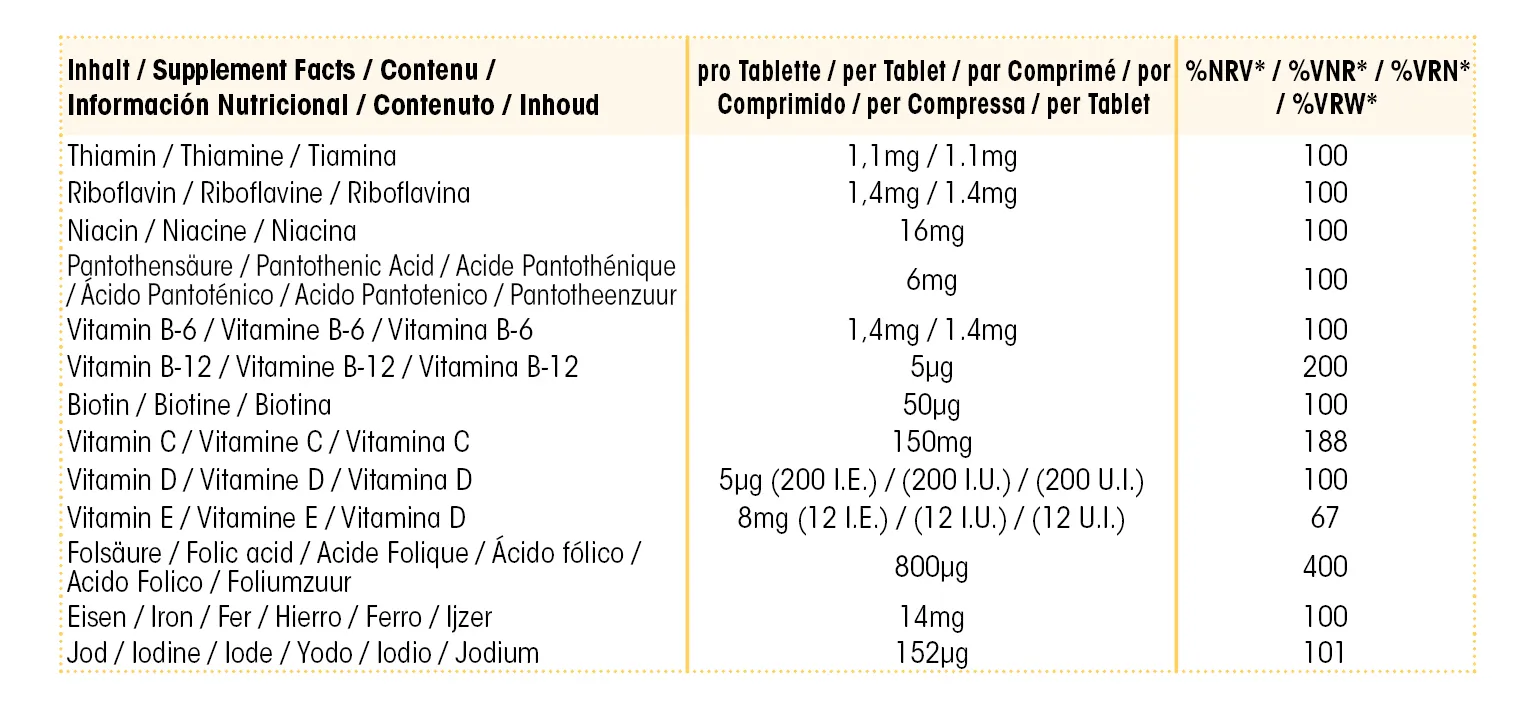 Calcium-L-Ascorbat (enthält 82,6% Vitamin C), Füllstoff mikrokristalline Cellulose, Eisencitrat (enthält 20% Eisen), Kaliumjodid, D-alpha-Tocopherylacetat, Nicotinamid, Calcium-D-Pantothenat, Methylcobalamin, Calciumsalze der Orthophosphorsäure, Cholecalciferol, Pyridoxinhydrochlorid, Riboflavin, Thiaminmononitrat, Pteroylmonoglutaminsäure, D-Biotin