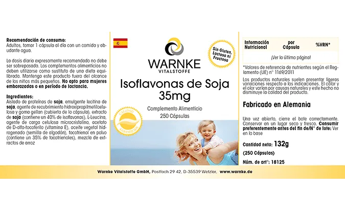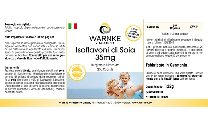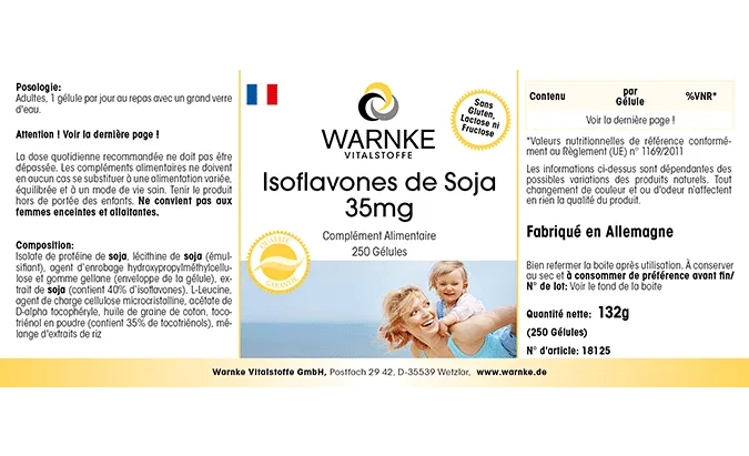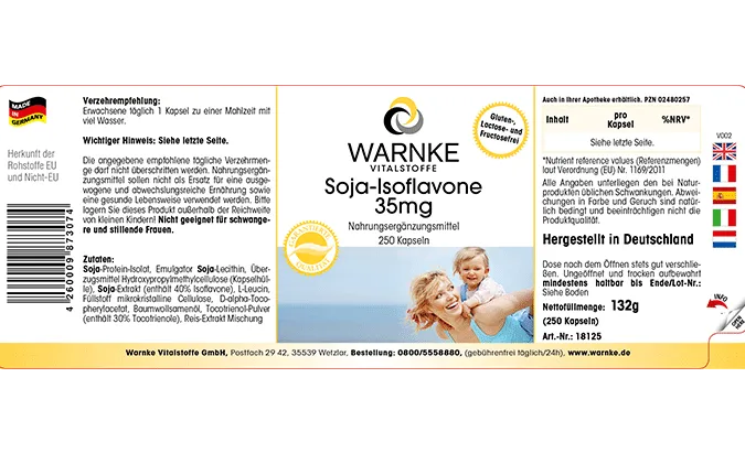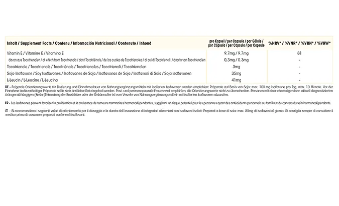 Soja-Protein-Isolat, Emulgator Soja-Lecithin, Überzugsmittel Hydroxypropylmethylcellulose (Kapselhülle), Soja-Extrakt (enthält 40% Isoflavone), Füllstoff mikrokristalline Cellulose, D-alpha-Tocopherylacetat, Tocotrienol-Pulver (enthält 35% Tocotrienole), Trennmittel Magnesiumsalze von Speisefettsäuren