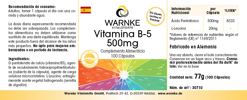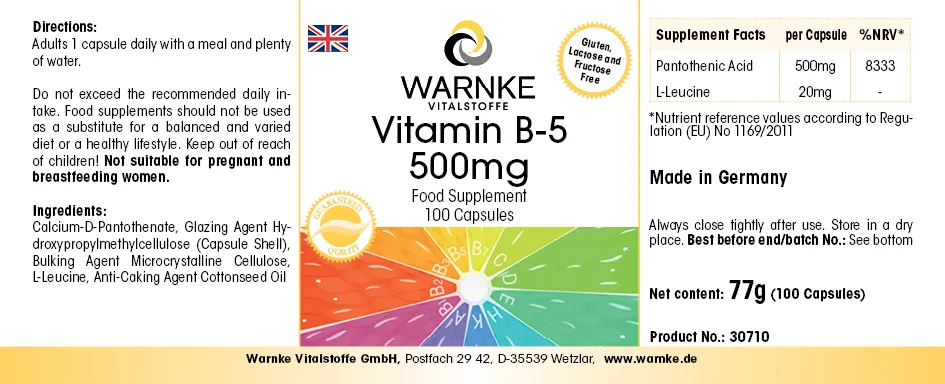 Calcium-D-pantothenat, Überzugsmittel Hydroxypropylmethylcellulose (Kapselhülle), Füllstoff mikrokristalline Cellulose, L-Leucin, Trennmittel Baumwollsamenöl