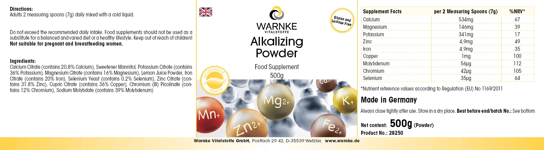Ingredients: Calcium Citrate (contains 20.8% Calcium), Sweetener Mannitol, Potassium Citrate (contains 36% Potassium), Magnesium Citrate (contains 16% Magnesium), Lemon Juice Powder, Iron Citrate (contains 20% Iron), Selenium Yeast (contains 0.2% Selenium), Zinc Citrate (contains 31.8% Zinc), Cupric Citrate (contains 36% Copper), Chromium (III) Picolinate (contains 12% Chromium), Sodium Molybdate (contains 39% Molybdenum)