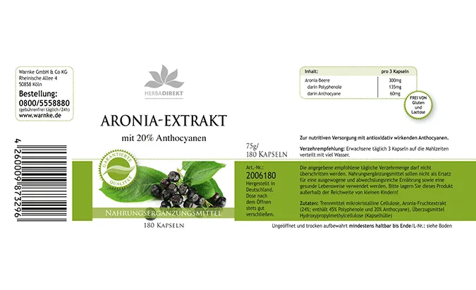 Bulking agent microcrystalline cellulose, Aronia berry extract (24%; contains 45% polyphenols and 20% anthocyanins), glazing agent hydroxypropylmethylcellulose (capsule shell).