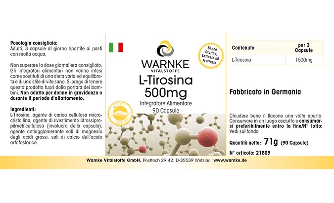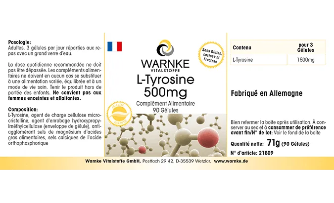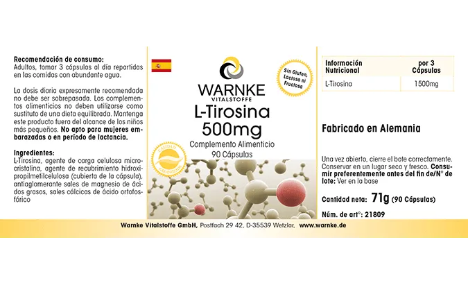 L-Tyrosine, Bulking Agent Microcrystalline Cellulose, Glazing Agent Hydroxypropylme- thylcellulose (Capsule Shell), Anti-caking Agent Magnesium Salts of Fatty Acids, Anti- Caking Agente Calcium Salts of Orthophos- phoric Acid, Anti-Caking Agent Potato Starch