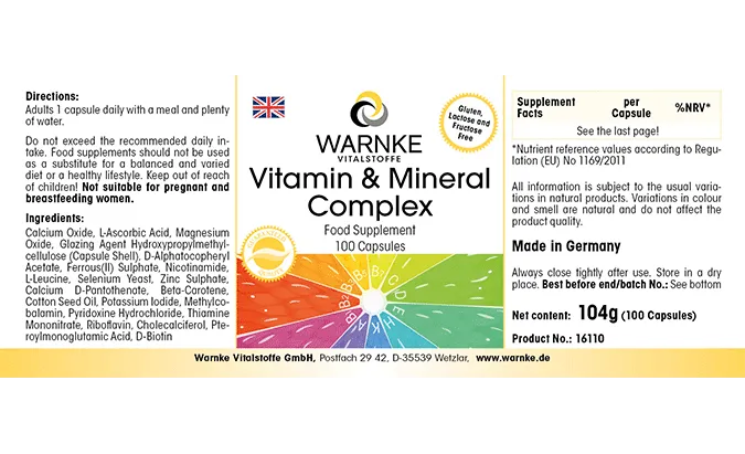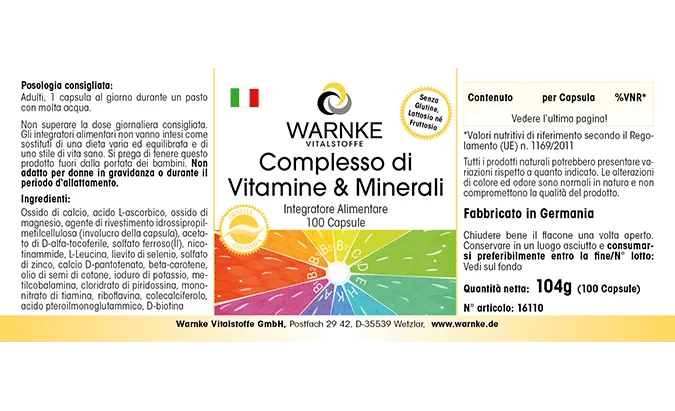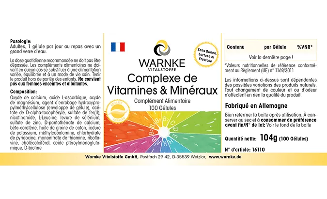 Calcium oxide, L-Ascorbic acid, magnesium oxide, glazing agent hydroxypropylmethylcellulose (capsule shell), D-alpha-tocopheryl acetate, iron (II) sulfate, nicotinamide, selenium yeast, zinc sulfate, calcium-D-pantothenate, anti-caking agent magnesium salts of fatty acids