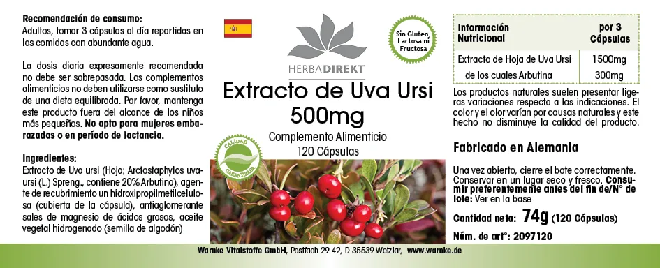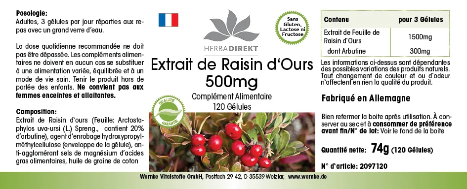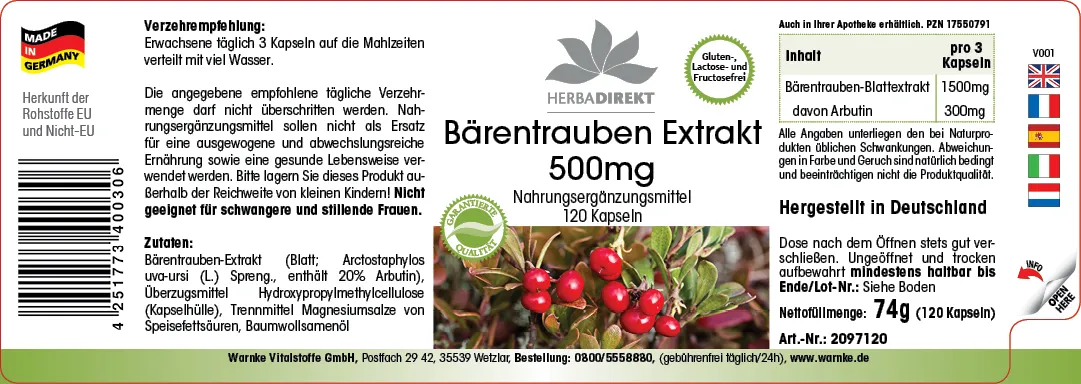 | Bärentrauben-Blattextrakt / Bearberry Leaf Extract / Extrait de feuilles de raisin d'ours / Extracto de hoja de gayuba / Estratto di foglie di uva ursina / Berendruifbladextract | 1500mg | |