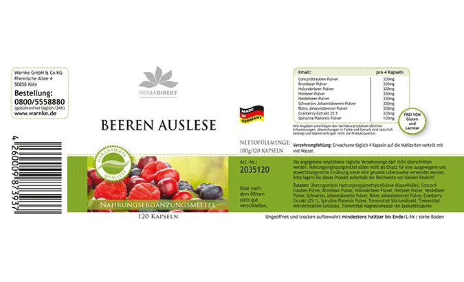 Hydroxypropylmethylcellulose coating (capsulehuls), Concord druivenpoeder, braampoeder, vlierbessenpoeder, frambozenpoeder, bosbessenpoeder, zwarte bessenpoeder, rode bessenpoeder, cranberry extract (25:1), Spirulina platensis poeder, antiklontermiddel siliciumdioxide, vulstof microkristallijne cellulose, antiklontermiddel magnesiumzouten van vetzuren