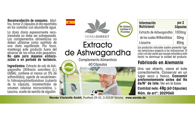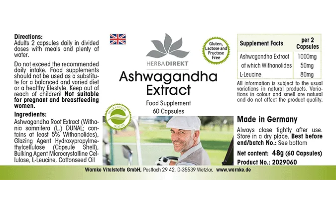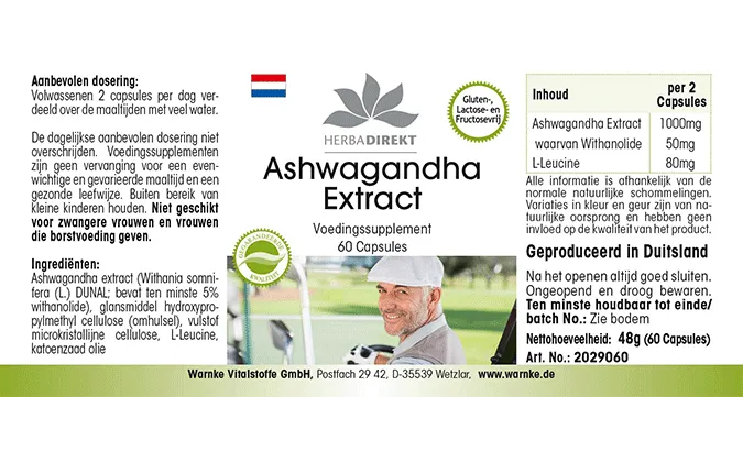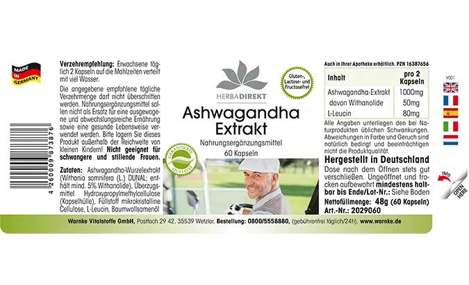 Ashwagandha-Extrakt (Withania somnifera, enthält mind. 5% Withanolide), Füllstoff mikrokristalline Cellulose, Überzugsmittel Hydroxypropylmethylcellulose (Kapselhülle), L-Leucin
