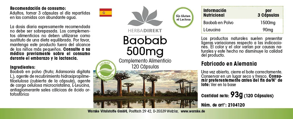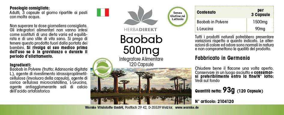 Baobab Pulver (Frucht; Adansonia digitata L.), Überzugsmittel Hydroxypropylmethylcellulose (Kapselhülle), Füllstoff mikrokristalline Cellulose, L-Leucin, Trennmittel Calciumsalze der Orthophosphorsäure