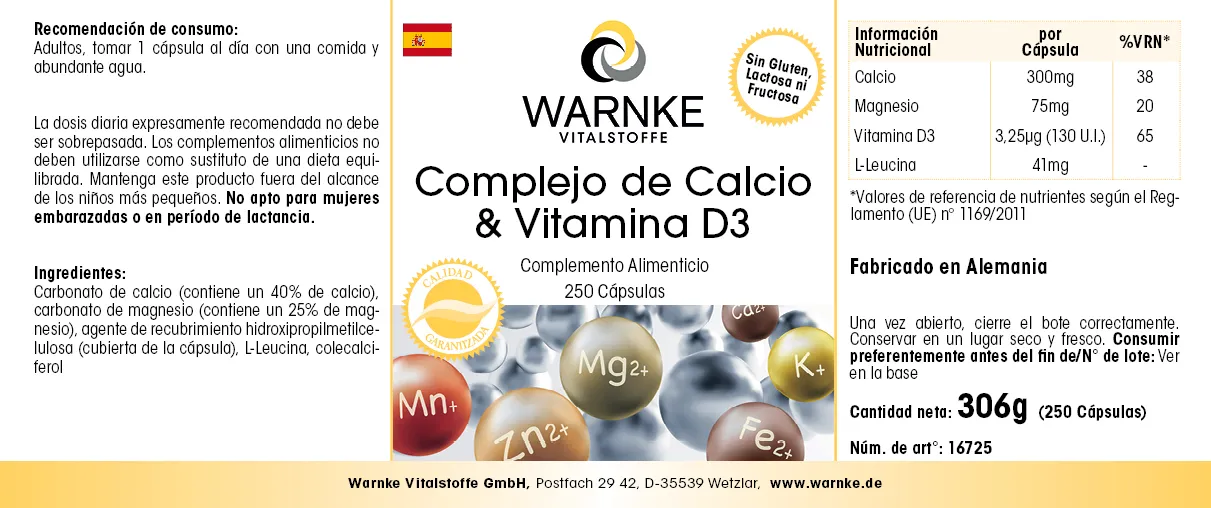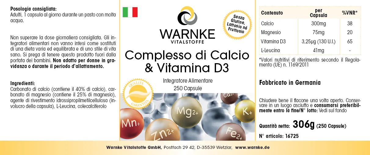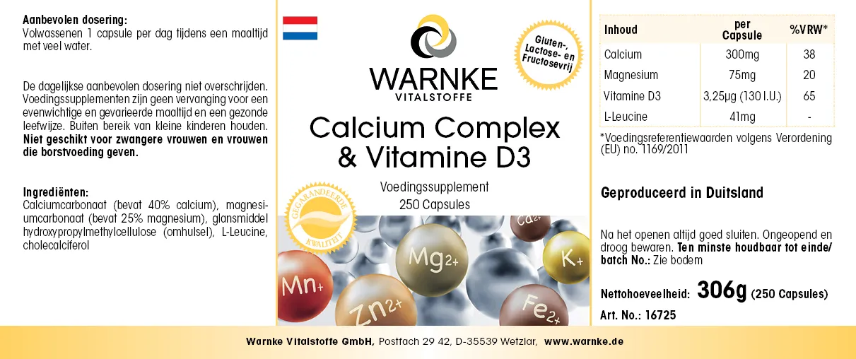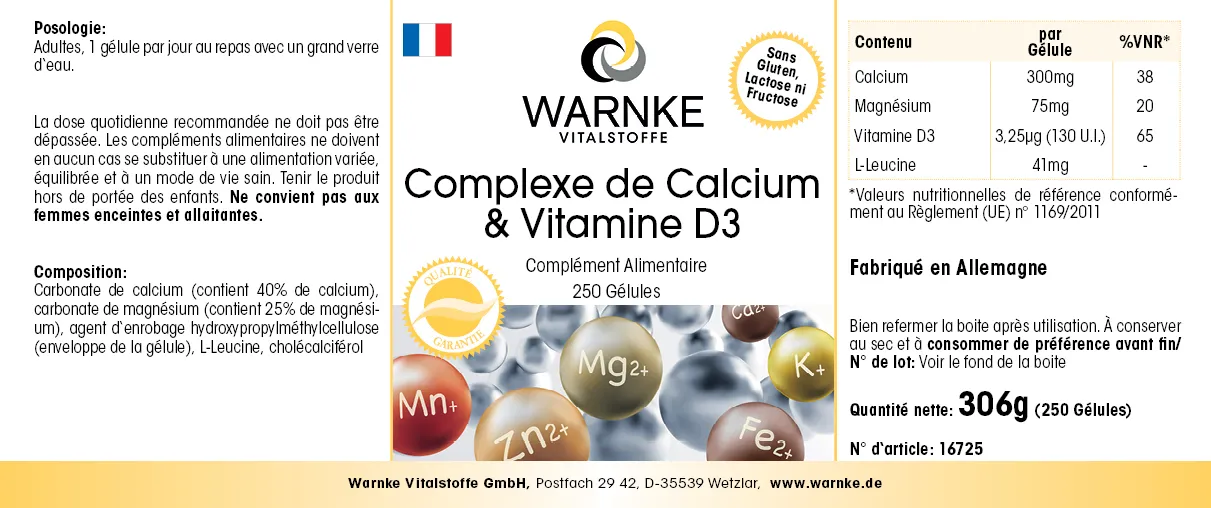 Calciumcarbonat (64%), Magnesiumcarbonat (25%), Überzugsmittel Hydroxypropylmethylcellulose (Kapselhülle), Cholecalciferol