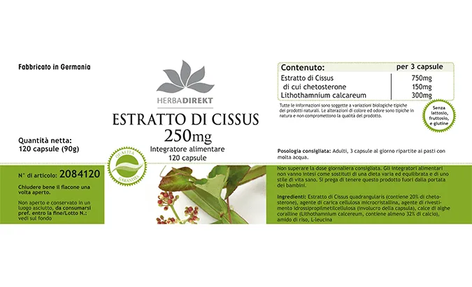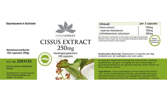 Cissus Quadrangularis-Extrakt (enthält 20% Ketosterone), Füllstoff mikrokristalline Cellulose, Überzugsmittel Hydroxypropylmethylcellulose (Kapselhülle), Korallenalgenkalk (Lithothamnium calcareum, enthält mindestens 32% Calcium), Reisstärke, L-Leucin