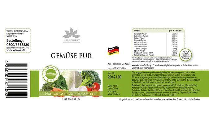 Überzugsmittel Hydroxypropylmethylcellulose (Kapselhülle), Karotten-Pulver, Petersilien-Pulver, Rüben-Pulver, Brokkoli-Pulver, Grünkohl-Pulver, Weißkohl-Pulver, Tomaten-Extrakt (enthält 5% Lycopin), Spinat-Pulver, Spirulina Platensis Pulver, L-Leucin, Füllstoff mikrokristalline Cellulose, Knoblauch-Extrakt (100:1)