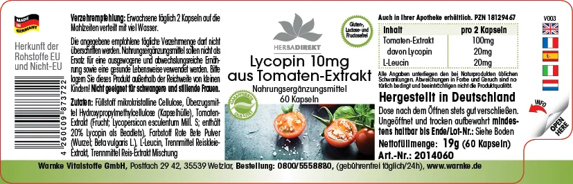 Tomaten-Extrakt (61%; enthält 5% Lycopin), Überzugsmittel Hydroxypropylmethylcellulose (Kapselhülle), Füllstoff mikrokristalline Cellulose, L-Leucin