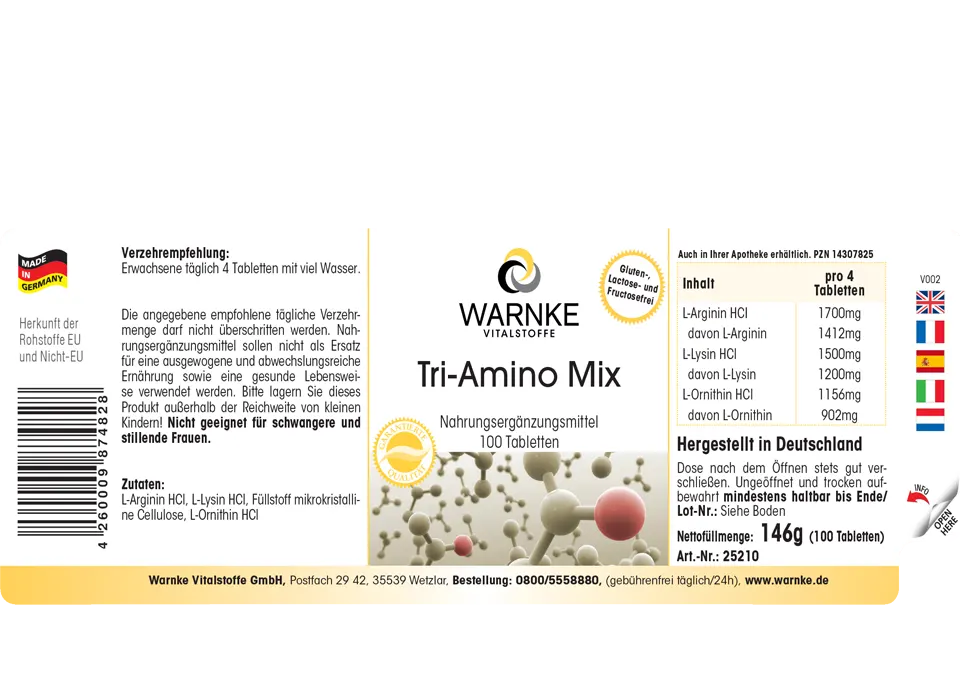 L-Arginin-HCl, L-Lysin-HCl, Füllstoff mikrokristalline Cellulose, L-Ornithin-HCl