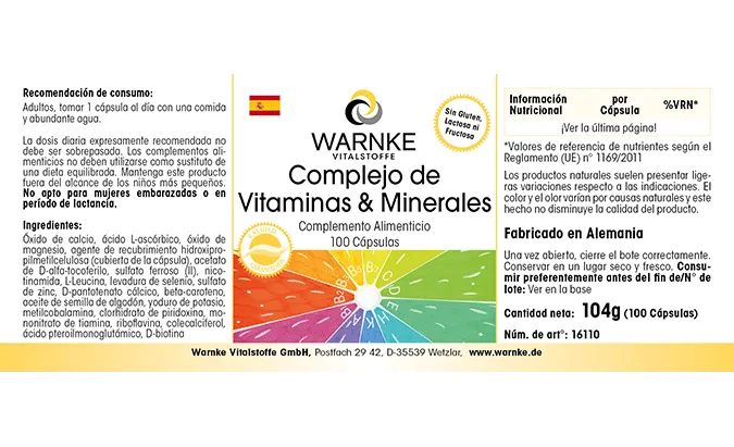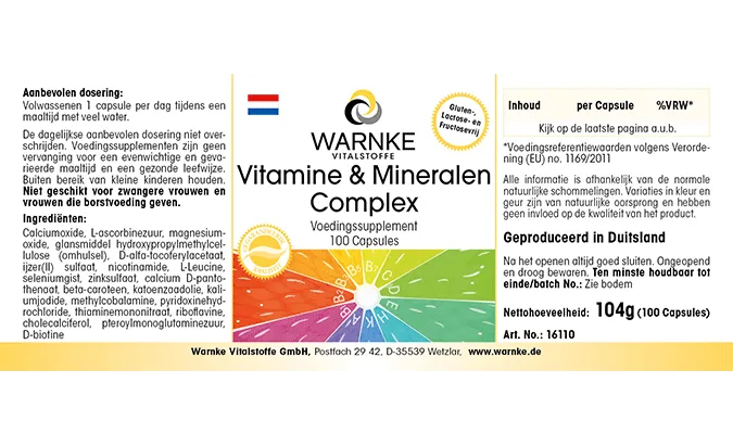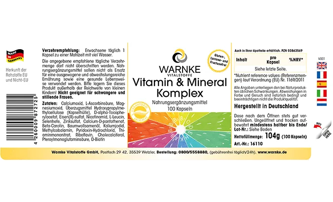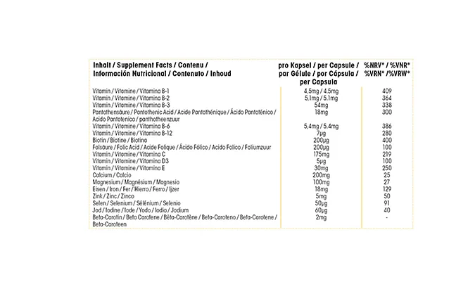Calciumoxid, L-Ascorbinsäure, Magnesiumoxid, Überzugsmittel Hydroxypropylmethylcellulose (Kapselhülle), D-alpha-Tocopherylacetat, Eisen-II-sulfat, Nicotinamid, Selenhefe, Zinksulfat, Calcium-D-pantothenat, Trennmittel Magnesiumsalze von Speisefettsäuren,