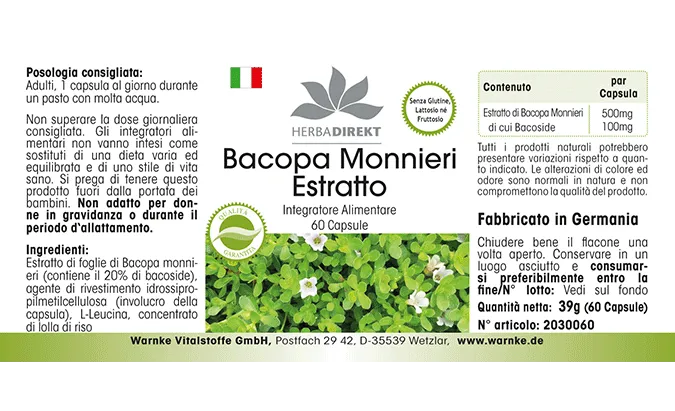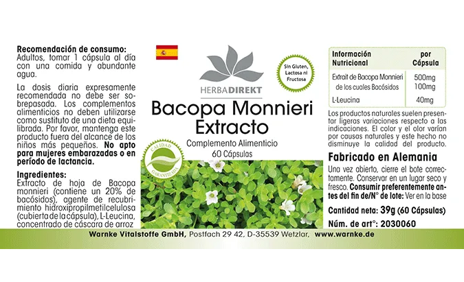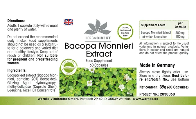Brahmi leaf extract (Bacopa monnieri, contains 20% bacosides), glazing agent hydroxypropylmethylcellulose (capsule shell), L-Leucine, rice hull concentrate.