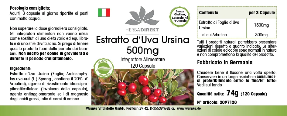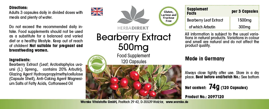 | Bärentrauben-Blattextrakt / Bearberry Leaf Extract / Extrait de feuilles de raisin d'ours / Extracto de hoja de gayuba / Estratto di foglie di uva ursina / Berendruifbladextract | 1500mg | |