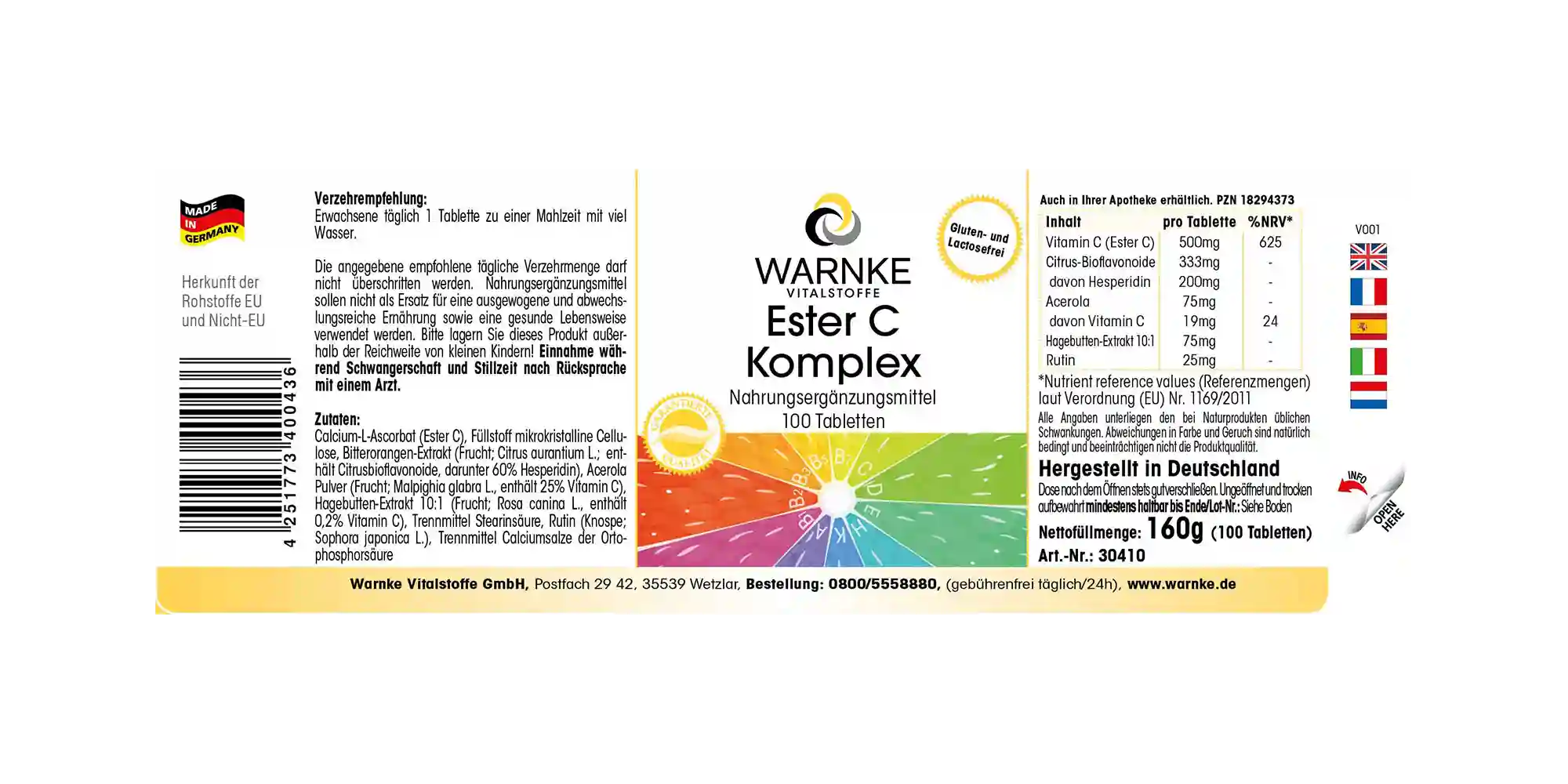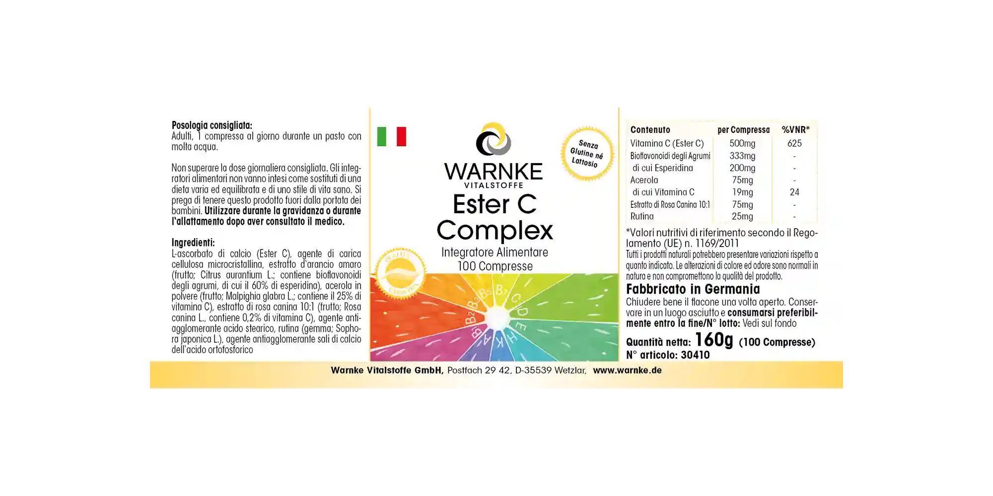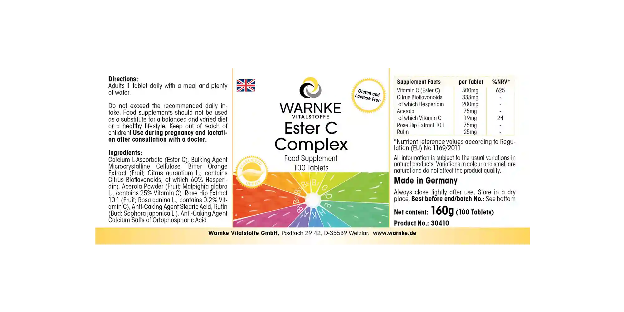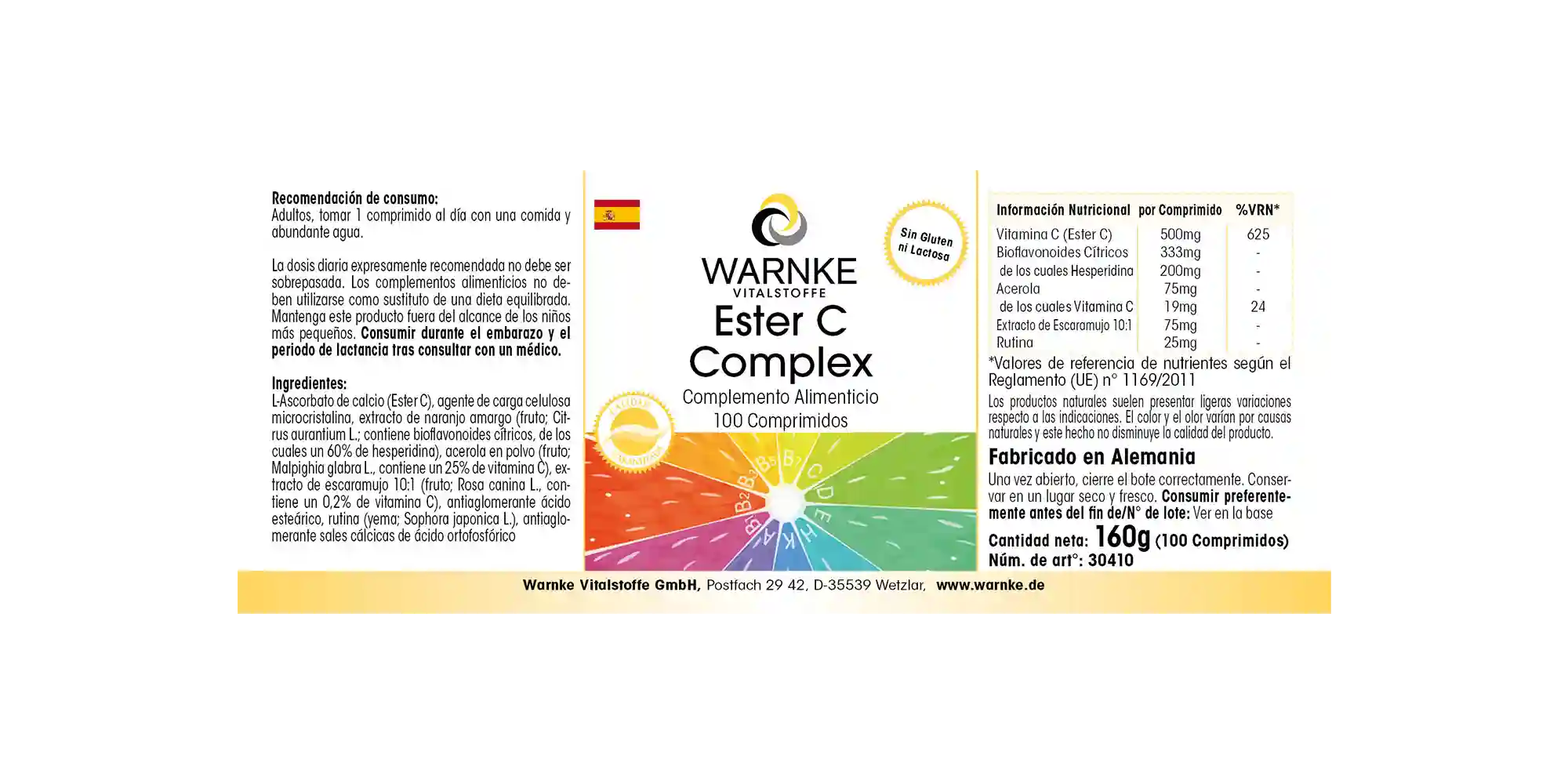 Ingredients: Calcium L-ascorbate (Ester C), filler microcrystalline cellulose, bitter orange extract (fruit; Citrus aurantium L.; contains citrus bioflavonoids, including 60% hesperidin), acerola powder (fruit; Malpighia glabra L., contains 25% vitamin C), rosehip extract 10:1 (fruit; Rosa canina L., contains 0.2% vitamin C), anti-caking agent stearic acid, rutin (bud; Sophora japonica L.), anti-caking agent calcium salts of ortophosphoric acid