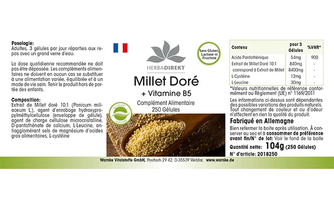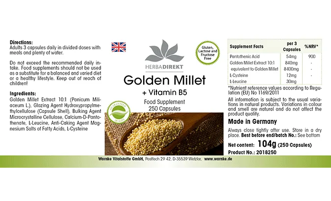 Golden millet extract 10:1 (Panicum miliaceum L.), glazing agent hydroxypropylmethylcellulose (capsule shell), bulking agent microcrystalline cellulose, calcium-D-pantothenate, L-Leucine, anti-caking agent magnesium salts of fatty acids, L-Cysteine.