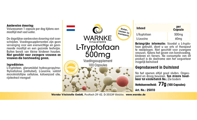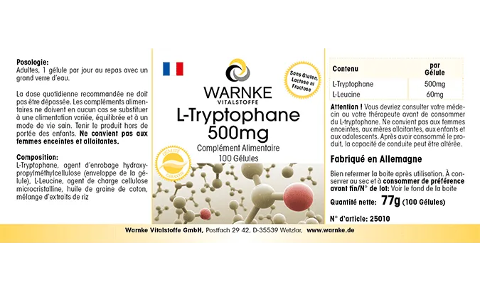 L-Tryptophan, glazing agent hydroxypropylmethylcellulose (capsule shell), L-Leucine, bulking agent microcrystalline cellulose, cottonseed oil, rice extract blend