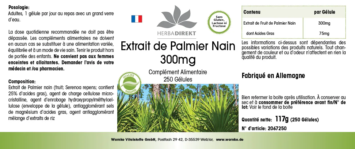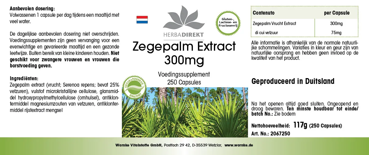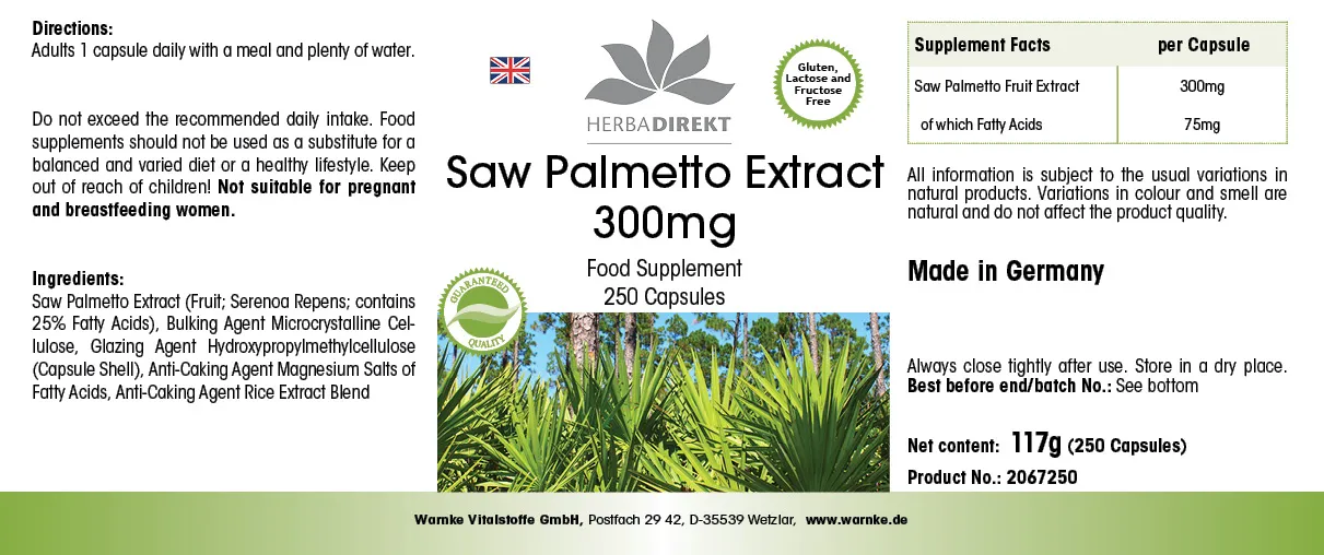 Saw palmetto fruit extract (Serenoa repens, contains 25% fatty acids and 0.07% beta-sitosterol), bulking agent microcrystalline cellulose, glazing agent hydroxypropylmethylcellulose (capsule shell), anti-caking agent magnesium salts of fatty acids.