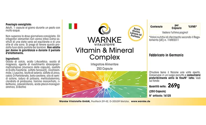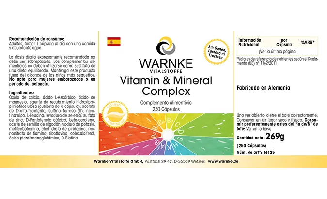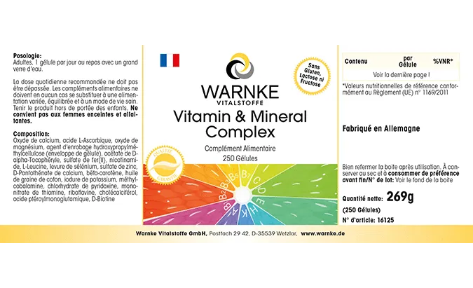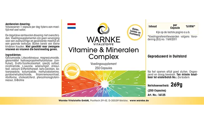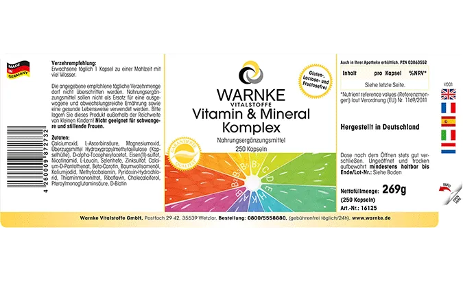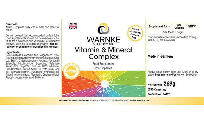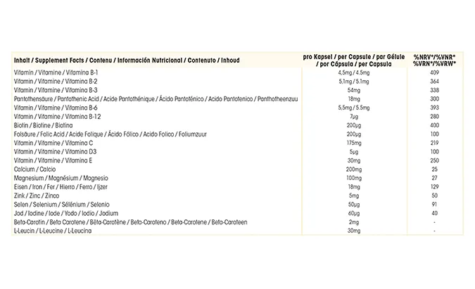 Calcium oxide, L-Ascorbic acid, magnesium oxide, glazing agent hydroxypropylmethylcellulose (capsule shell), D-alpha-tocopheryl acetate, iron (II) sulfate, nicotinamide, selenium yeast, zinc sulfate, calcium-D-pantothenate, anti-caking agent magnesium salts of fatty acids