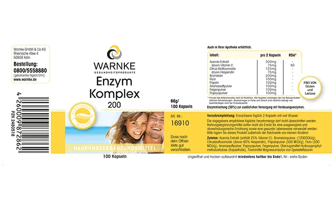 Extracto de acerola (contiene un 25% de vitamina C), bromelina en polvo (1200 GDU/g), bioflavonoides cítricos (de los cuales un 60% de hesperidina), papaína en polvo (500 MCU/g), ficina (500 MCU/g), zumo de piña en polvo, papaya en polvo, higo en polvo, agente de recubrimiento hidroxipropilmetilcelulosa (cubierta de la cápsula), antiaglomerante sales de magnesio de ácidos grasos