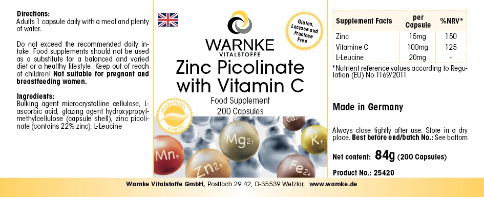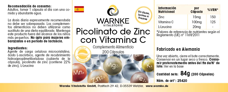 Agente de carga celulosa microcristalina, ácido L-Ascórbico, agente de recubrimiento hidroxipropilmetilcelulosa (cubierta de la cápsula), picolinato de zinc (contiene un 22% zinc), L-Leucina