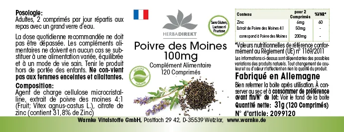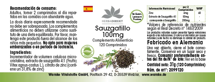 Agente de carga celulosa microcristalina, extracto de sauzgatillo 4:1 (Vitex agnus-castus L.), citrato de zinc (contiene un 31,8% de zinc)