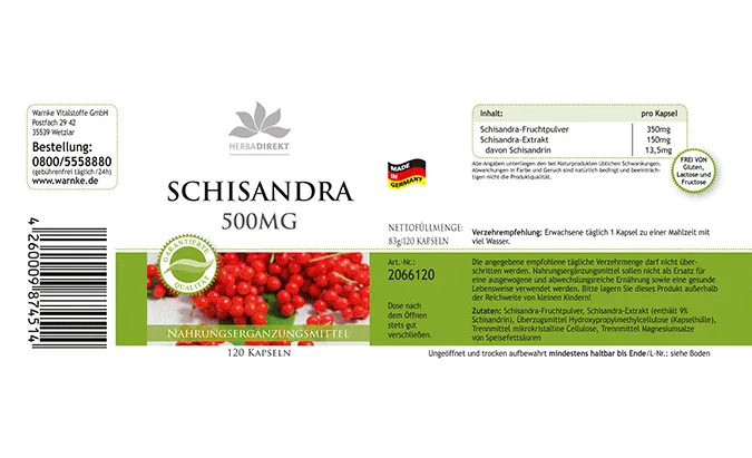Bayas de Schisandra en polvo, extracto de Schisandra (contiene un 9% de schisandrina), agente de recubrimiento hidroxipropilmetilcelulosa (cubierta de la cápsula), agente de carga celulosa microcristalina, antiaglomerante sales de magnesio de ácidos grasos