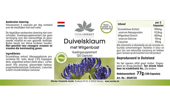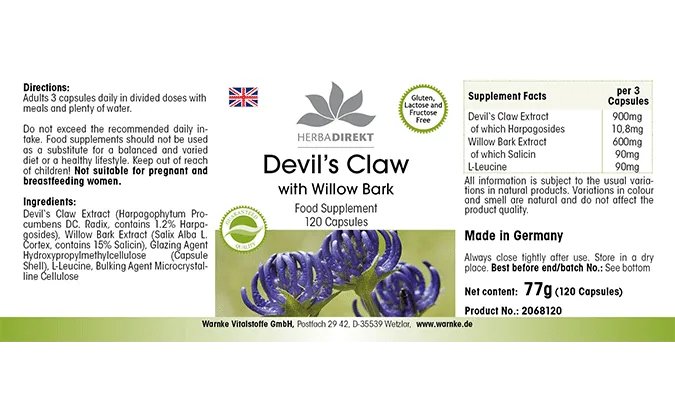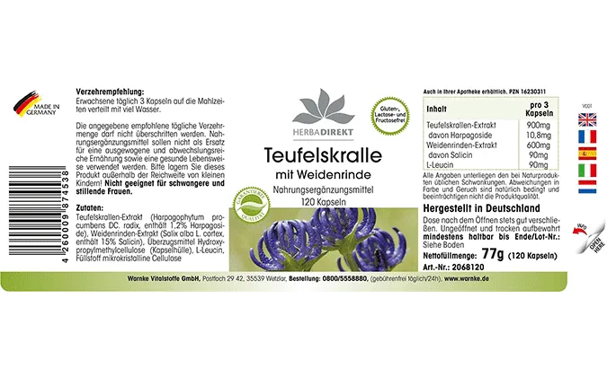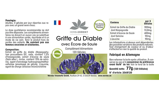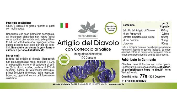 Estratto di artiglio del diavolo (Harpagophytum procumbens DC. radix, contiene l’1,2% arpagosidi), estratto di corteccia di salice (Salix alba L. cortex, contiene il 15% di salicina), agente di rivestimento idrossipropilmetilcellulosa (involucro della capsula), L-Leucina, agente di carica cellulosa microcristallina