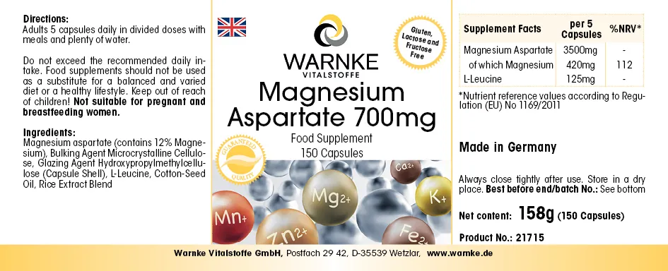 Magnesio Aspartato (contiene il 12% di magnesio), agente di carica cellulosa micro- cristallina, agente di rivestimento idrossipro- pilmetilcellulosa (involucro della capsula), L-Leucina, olio di semi di cotone, miscela di estratti di riso
