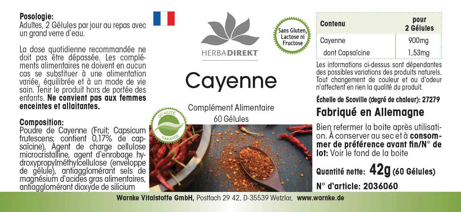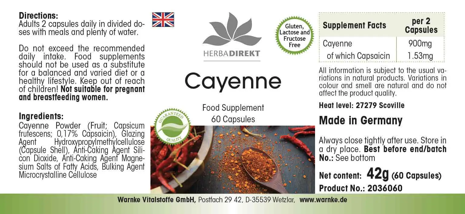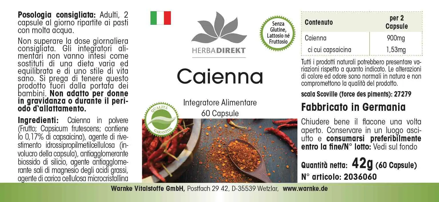 Cayenna in polvere (Capsicum frutescens L.; contiene lo 0,17% di capsaicina), agente di rivestimento idrossipropilmetilcellulosa (involucro della capsula), agente antiagglomerante diossido di silicio, agente antiagglomerante sali di magnesio degli acidi grassi, agente di carica cellulosa microcristallina