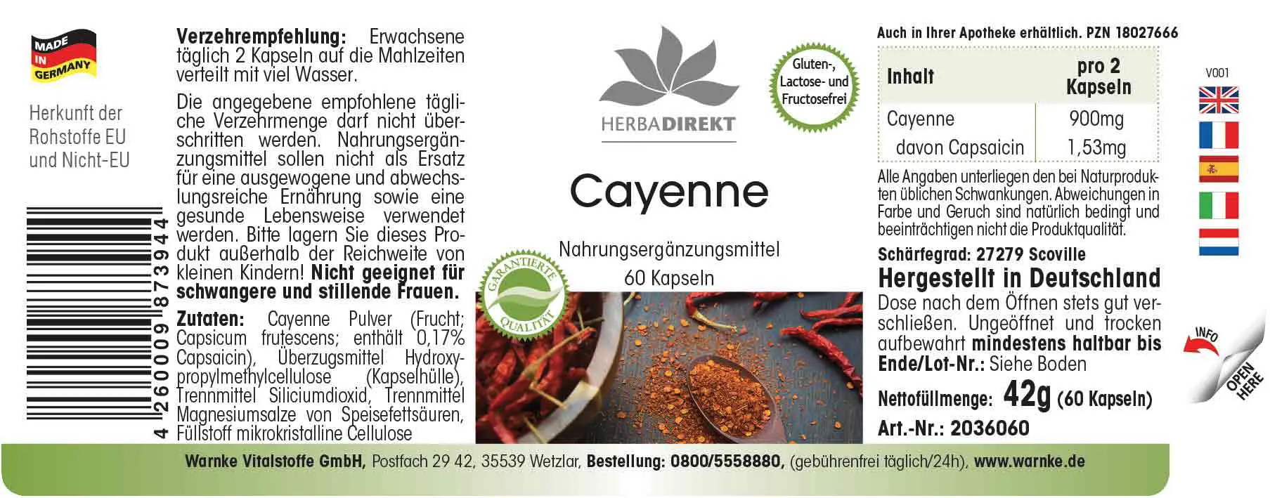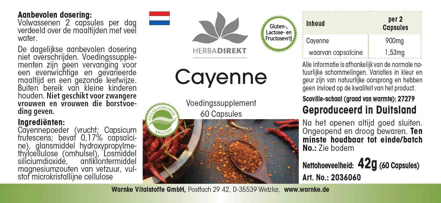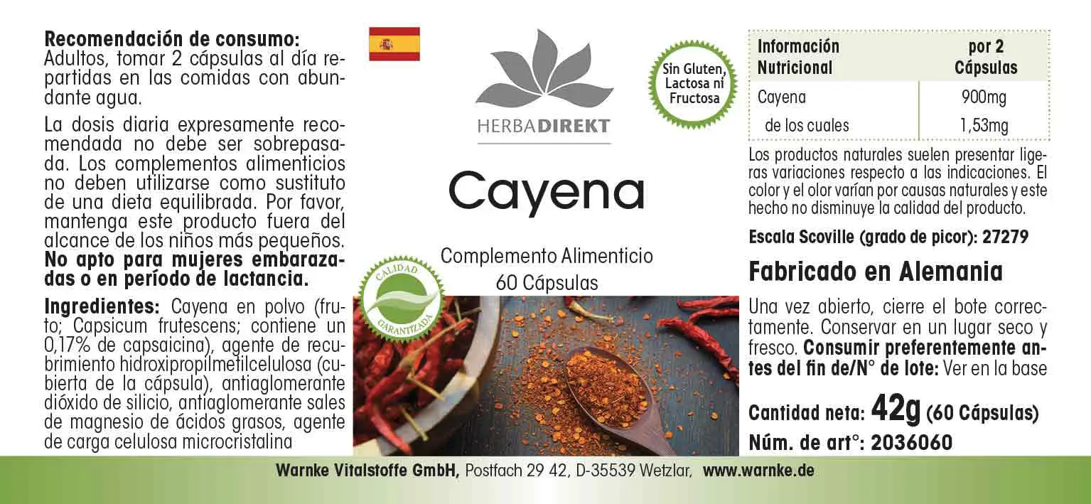 Cayenna in polvere (Capsicum frutescens L.; contiene lo 0,17% di capsaicina), agente di rivestimento idrossipropilmetilcellulosa (involucro della capsula), agente antiagglomerante diossido di silicio, agente antiagglomerante sali di magnesio degli acidi grassi, agente di carica cellulosa microcristallina